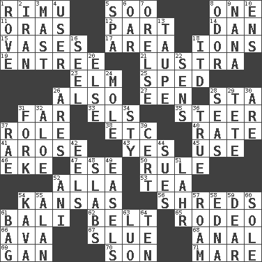 ACROSS 1. Tall New Zealand timber tree 5. "Barney Miller" actor Jack 8. Single 11. Mouths or openings 12. Piece 14. Daniel's nick name 15. Flower holders 17. Length times width 18. Charged atoms 19. Main course 21. A period of five years 23. Shade tree 25. Broke a traffic law 26. In addition 27. Car or cant ending 28. R.R. building 31. At a great distance 33. Raised railways 35. Guide 37. Hero or heavy, e.g. 38. And so on (abbr.) 40. Pace 41. Came up 43. Consenting reply 45. Purpose 46. Make supply last 47. Compass dir. 50. General guideline 52. Silent film actress Nazimova 53. Afternoon social gathering 54. Sunflower state 56. Fragments 61. Indonesian resort city 62. Waist strap 65. Cowboy competition 66. Actress Gardner 67. Turn sharply 68. Of or related to the anus 69. Separate the seeds from cotton 70. Male offspring 71. Female horse DOWN 1. Be footloose 2. SW Asia republic 3. Vertical spar for supporting sails 4. One who makes use of a thing 5. Health resort 6. Rowing implement 7. Threatening words 8. Scent 9. Grandmother 10. Followers of ems 13. Grayish beige 16. Stitch closed the eyes of (a falcon) 18. It would 20. Otherwise 22. Elected reps. 24. Undercover agent 26. Ancient Greek god of war 28. Oceans 29. Wig 30. "We ___ not amused" (Victoria) 31. Tined utensil 32. Medicinal plant 34. Filthy place 36. Loyal 37. Actress Charlotte 39. Certainty 42. Snakelike fish 44. Institutes legal proceedings 48. Thick slices 49. Artist's stands 51. Cowardly lion portrayer 52. Cuckoo 54. Polynesian shrub of the pepper family 55. ____ Jay Lerner 57. Wander aimlessly 58. Pulitzer Prize-winning author Ferber 59. Letter starter 60. Not divided or shared with others 61. Container for groceries 63. Nilotic language 64. "___ Little Indians"