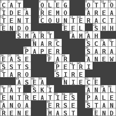 ACROSS 1. Feline 4. Cassini of fashion 8. "Beetle Bailey" pooch 12. It may be bright or harebrained 14. San ____ (Riviera town) 15. Length times width 16. Portable shelter 17. Frustrate 20. Inside; within (prefix) 21. Snakelike fish 22. Quiet! 23. Don Adams' spy role 27. Wet nurse 29. Drug cop 31. Get outta here! 34. Some stationery 35. "Two Mules for Sister ____" 36. Comfort 39. At a great distance 41. Afresh 42. Fast planes 43. _ dish (used to culture cells) 46. Edible starchy tuberous root 47. Beget 48. At sea 51. Sibling's daughter 54. Make lace 56. What Jean-Claude Killy likes to do 58. Of or related to the anus 61. Pleas 66. Diluted with white 67. Small Philippine buffalo 68. Celtic language 69. Comedian Laurel of Laurel & Hardy 70. French philosopher Descartes 71. Vertical spar for supporting sails 72. Conclude DOWN 1. Quote 2. An important port of Yemen 3. Watches over 4. The grampus (Milton) 5. Lion 6. Australian flightless bird 7. Went 8. Rowing implement 9. File 13 10. Georgia ____ (Atlanta school) 11. Pledge 13. Tiny particle 18. Afternoon social gathering 19. Shade tree 24. Santa ___, CA 25. Hit sharply and swiftly 26. Unclean, religiously 28. Slender Brazilian palm 30. Dice game 32. "We ___ not amused" (Victoria) 33. The 23rd letter of the Hebrew alphabet 34. Mexican monetary units 36. Eastern Standard Time (abbr.) 37. White ___ sheet 38. Ski resort town in Vermont 40. It's straight from the horse's mouth 44. Three (prefix) 45. Portuguese money of account (variant) 49. Compass dir. 50. Alias (abbr.) 52. Smile enhancers 53. Maternal 54. Rend 55. Singer Murray 57. A distinct part 59. Actor Alda or Thicke 60. Grant temporary use of 62. Actress Charlotte 63. Lyricist Gershwin 64. Curvy letter 65. Arrange properly for use