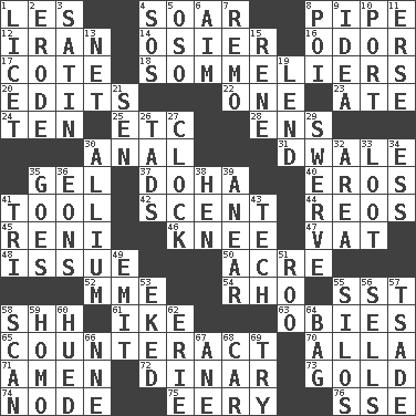 ACROSS 1. French article 4. Fly high 8. Corncob 12. SW Asia republic 14. Flexible twig of a willow tree 16. Scent 17. ____ d'Azur (French Riviera) 18. Wine waiters 20. Prepares for publication 22. Single 23. Had dinner 24. Nine, plus one 25. And so on (abbr.) 28. Followers of ems 30. Of or related to the anus 31. A sleeping potion; an opiate (poet.) 35. Set 37. Capital of the state of Qatar 40. Greek god of love 41. Utensil 42. Odor 44. Vintage cars 45. Painter Guido (1575-1642) 46. Leg joint 47. Large container 48. Come out of 50. 1/640 square mile 52. Madame (abbr.) 54. 17th letter of the Greek alphabet 55. Fast jet (abbr.) 58. Quiet! 61. Mamie's mate 63. Off-Broadway awards 65. Neutralize 70. Silent film actress Nazimova 71. So be it 72. Middle Eastern gold or silver currency 73. Precious metal 74. Thickened enlargement 75. Suggestive of the supernatural 76. Compass dir. DOWN 1. It is permitted: Lat. 2. Eat (away) 3. Smooth fabric 4. Distress signal 5. Bear (Spanish) 6. Direct toward a target or goal 7. San ____ (Riviera town) 8. Luau course 9. The content of cognition 10. Sweet dark-red dessert wine 11. Celtic language 13. Remaining after all deductions 15. French philosopher Descartes 19. Grant temporary use of 21. Elected rep. 26. Bits 27. Timepiece 29. Turn aside suddenly 30. Plant genus of onion and garlic 32. Type of rug 33. Plunder 34. Curvy letter 35. Travels 36. Immeasurably long periods of time 38. Layer 39. Approach 41. Three (prefix) 43. Technical work 49. Give off 51. Friend of Pooh 53. Made supply last 55. Grain storage towers 56. Makes a sale 57. Sadhe (variant) 58. Glance over 59. Like (prefix) 60. Became colored 62. 4th largest of the Great Lakes 64. Container for groceries 66. Compass dir. 67. One (Scot) 68. Auto 69. Attempt