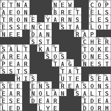 ACROSS 1. Inactive volcano in Sicily 5. ___ Haven, CT 8. Police officer (slang) 11. A really long time 12. Cy Young winner Saberhagen 14. Raised railways 15. Marketplace scale 17. Tall tales 18. French article 19. Gist 21. R.R. building 22. Car dealer's back yard 23. Born 24. Daniel's nick name 25. Reproach for some lapse or misdeed 27. Fast jet (abbr.) 28. "Mermaids" star 31. Table seasoning 35. Krazy ___ of comics 37. Casino tip 38. Type of rug 39. Mayday 41. Singles 42. Lightbulb-shaped fruit 43. Label 45. Egg locale 46. Fast planes 47. Make lace 49. Part of HMS, perhaps 51. Shoshoni 52. Ocean 55. Observe 57. Followers of ems 60. Thinks logically 62. Hearing organ 63. Pitcher Ryan 65. Table seasonings 66. Compass dir. 67. Letter starter 68. The main thing one is thinking about 69. Directed 70. Potassium hydroxide 71. Dormintory (informal) DOWN 1. Ingested 2. Laconic 3. Trap for birds or small mammals 4. Queen of England 1702-14 5. Basketball assoc. 6. Blunders 7. Left 8. Portable communications device 9. Margarine 10. Inconspicuous attention getter 13. Russian ruler of old 16. Extremities 17. Gossips 20. Keg 26. 13-14th century defensive garment 29. Makes supply last 30. Take ten 31. Plant excrements 32. Ancient Greek god of war 33. Resembling or made to resemble leather 34. Tarsus (plural) 36. Small child 40. Titan orbits this 44. Yard entry 48. Beverages made from leaves 50. Transmit 52. Twentieth part of a lira 53. Keyboard key 54. Indian state 55. Sew up the eyelids of hawks and falcons 56. Comfort 58. Christmas carol 59. Kill 61. Stated 64. "We ___ not amused" (Victoria)