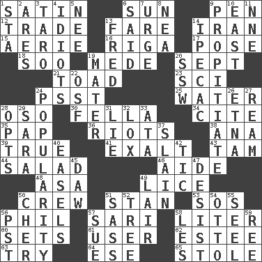 ACROSS 1. Smooth fabric 6. Player for Phoenix 9. Animal enclosure 12. Barter 13. Conductor's collection 14. SW Asia republic 15. Nest on high 16. Port city in Latvia 17. Airs 18. "Barney Miller" actor Jack 19. Ancient Persian 20. Back-to-school mo. 21. Frog relative 23. _-fi 24. Inconspicuous attention getter 25. Wetness 28. Bear (Spanish) 30. Man or boy (slang) 34. Quote 35. Infant food 36. Disturbances 38. Santa ___, CA 39. Loyal 41. Honor 43. Scottish cap 44. Vegetable dish 46. Helper 48. White ___ sheet 49. Louse (plural) 50. Ship's personnel 51. Comedian Laurel of Laurel & Hardy 53. Distress signal 56. Silvers or Donahue 57. Indian skirt 58. 61 cubic inches 60. Puts into a specified state 61. One who makes use of a thing 62. First name in cosmetics 63. Attempt 64. Compass dir. 65. Took without asking DOWN 1. R.R. building 2. Ancient Greek god of war 3. Pacific island yam 4. Foolish or stupid persons 5. Born 6. Expressed in words 7. Goad 8. Teachers' org. 9. Appease 10. 90 degrees 11. Compass dir. 13. Flintstone 14. Medicinal drug used to evoke vomiting 19. Mother 20. Compass dir. 22. Order of Saint Francis (abbr.) 24. Teen's desire 26. Inactive volcano in Sicily 27. 480, 500 or 516 sheets of paper 28. Elects 29. "Two Mules for Sister ____" 31. Falsehood 32. Brine-cured salmon 33. "One Day ___ Time" 37. Killed 40. Artist's stands 42. Nervous spasm 45. Simpleton 47. Stop 49. Den 50. "Mermaids" star 51. Backtalk 52. Relationship diagram 54. "Beetle Bailey" pooch 55. Stitch closed the eyes of (a falcon) 56. Pacific Standard Time (abbr.) 57. Institute legal proceedings 58. French article 59. To separate or throw off