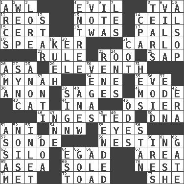 ACROSS 1. Leather borer 4. Tending to cause great harm 8. Federal power corp. 11. Vintage cars 13. Make mention of 14. To provide with a ceiling 15. Foregone conclusion 16. It was, poetically 17. Friends 18. Orator 21. Monte _, Las Vegas Hotel/Casino 22. Governing power 23. Friend of Pooh 25. Plant excrement 26. White ___ sheet 29. Veterans Day date 32. Non-adult bird? 34. Compass dir. 35. Night before a holiday 38. At once, immediately (arch.) 39. Gurus 41. Method 43. Domesticated feline 44. _ tizzy (2 wds.) 45. Flexible twig of a willow tree 46. Consumed 50. Heredity factor (abbr.) 51. Cuckoo 54. Compass dir. 55. Sight organs 57. Something which is sent 59. Nestling 63. Grain storage tower 64. Mild oath 67. Length times width 68. Toward the sea 69. Not divided or shared with others 70. A home for chicks 71. Was introduced to 72. Frog relative 73. A female animal or person DOWN 1. Curves 2. Shed a tear 3. Old wives' tales, e.g. 4. Main course 5. Promise 6. Call ___ day 7. French article 8. Pulls apart 9. Country estate 10. Columnist Joseph or Stewart 12. Play the lead 14. Numbers guy (abbr.) 19. Malaysian steamed pastry 20. Pipe bend 21. Small bed 23. French philosopher Descartes 24. Washington bills 26. Wet nurse (var.) 27. Synchronize (abbr.) 28. Small Philippine buffalo 30. Viva Las _ 31. Equivocates 33. Opposed to 36. Nothingness 37. Genesis locale 39. Omen 40. Afresh 42. Period 45. Lyric poems 47. Compass dir. 48. Looked after 49. Sight organ 51. Indian state 52. Annoying sound 53. An arm off of a larger body of water 56. Comedian Laurel of Laurel & Hardy 58. ___ good deed 60. Angers 61. Delicate 62. Yard entry 64. Eastern Standard Time (abbr.) 65. Thick or sticky substance 66. Insect wing