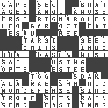 ACROSS 1. Stare wonderingly 5. Religious group 9. Naughty child 13. Eras 14. Mine, in Marseilles 15. Came up 16. Celtic language 17. Frustrating wastes of time 19. Lion 20. Slender fish 21. Sep. follower 22. Erode 23. He sold his birthright 25. To riddle 26. Tarsus (plural) 30. Sew up the eyelids of hawks and falcons 34. Leaves out 35. _ china 36. Spoken 39. Fertile tracts in a desert 42. Egg locale 43. Move on water 44. Exploiting 46. Elects 47. First name in cosmetics 48. Coat; cloak 51. Neighbor of Neb. 54. Insect wing 57. Actress Charlotte 58. Quiet! 60. To free from 62. Unrelated to defense, as in spending 65. Title for a man of rank and authority 66. Collection of objects 67. Puts into a specified state 68. Water falling in drops from the sky 69. Transmit 70. 90 degrees 71. Taverns DOWN 1. Highlander 2. Match 3. Mexican monetary units 4. Compass dir. 5. "Two Mules for Sister ____" 6. Independent ruler or chieftain 7. Gear tooth 8. Southeast Indonesia island 9. Sis' sibling 10. Hero or heavy, e.g. 11. Toward the sea 12. Trial 15. Johnson of "Laugh-In" 18. Adept person 20. Island territory of the United States 24. Ringlike coral islands and reefs 27. River (Sp.) 28. R.R. building 29. Come out of 30. Scorched 31. Compass dir. 32. Begley and Asner 33. Car dealer's back yard 36. Bear (Spanish) 37. Reproach for some lapse or misdeed 38. Small island 40. Curvy letter 41. Be seated 45. Delicate 48. Family _ (genealogy) 49. Clumsy lout 50. Honkers 52. Believer in; advocate of (suffix) 53. Japanese brewing company 54. Pismires 55. Old wives' tales, e.g. 56. Soon (poet.) 58. Fast planes 59. Behest 61. Cub Scout units 63. Movie disc 64. Teachers' org. 65. _ Lanka