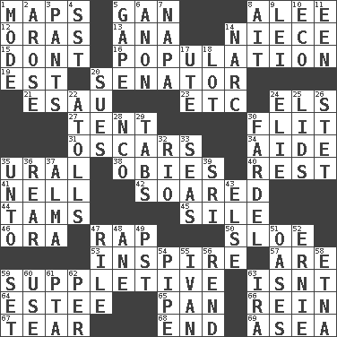ACROSS 1. Atlas contents 5. Separate the seeds from cotton 8. Toward shelter 12. Mouths or openings 13. Santa ___, CA 14. Sibling's daughter 15. Do not 16. Census information 19. Eastern Standard Time (abbr.) 20. Elected representative 21. Son of Isaac 23. And so on (abbr.) 24. Raised railways 27. Portable shelter 30. Sudden quick movement 31. Motion picture awards 34. Helper 35. Mountain range 38. Off-Broadway awards 40. Remainder 41. 1994 drama film starring Jodie Foster 42. Flew 44. Scottish caps 45. Filth; sediment 46. Mouth or opening 47. Reproach for some lapse or misdeed 50. _ gin 53. Stimulate to action 57. "We ___ not amused" (Victoria) 59. Supplying deficiencies 63. Is not 64. First name in cosmetics 65. Baking dish 66. It's straight from the horse's mouth 67. Separate forcefully 68. Conclusion 69. Toward the sea DOWN 1. Method 2. Came up 3. Leg coverings 4. Fast jet (abbr.) 5. Stare wonderingly 6. At once, immediately (arch.) 7. California wine valley 8. Small island 9. Flowery wreath 10. Environmental prefix 11. Car or cant ending 14. Drug cop 17. Shoshoni 18. Car dealer's back yard 20. Institutes legal proceedings 22. Ringlike coral islands and reefs 24. Writer Wiesel 25. Flaplike coverings 26. Proofreading order 28. Non-commissioned officer (abbr.) 29. Bar bills 30. Burden 32. _ de Janeiro 33. Oceans 35. To (old English) 36. Hitchcock's "____ Window" 37. _ mater 39. Indian title of respect (Mr.) 43. Otherwise 47. Cause heat under the collar 48. A saturated hydrocarbon 49. Pacific Standard Time (abbr.) 51. Fertile tracts in a desert 52. Bert's buddy 54. Corncob 55. "Terrible" tsar 56. Tear apart 58. Inactive volcano in Sicily 59. Arrange properly for use 60. Purpose 61. Parent Teacher Association (abbr.) 62. For each 63. Lyricist Gershwin