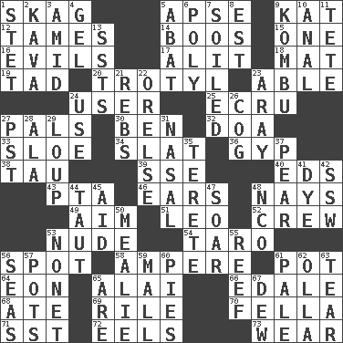 ACROSS 1. Heroin 5. Domed church section 9. Krazy ___ of comics 12. Makes less strong or intense 14. Expressions of contempt or scorn 15. Single 16. Vices 17. Came down and settled, as after flight 18. Floor protector 19. Small boy 20. Trinitrotoluene 23. Competent 24. One who makes use of a thing 25. Shade of tan 27. Friends 30. Benjamin's nick name 32. ___ good deed 33. A type of plum 34. Narrow board 36. Swindle 38. The 19th letter of the Greek alphabet 39. Compass dir. 40. Begley and Asner 43. Parent Teacher Association (abbr.) 46. Hearing organs 48. Negative votes 49. Direct toward a target or goal 51. Lion 52. Group working together 53. Unadorned 54. Pacific island yam 56. Specific locale 58. Electrical Unit 61. Cooking vessel 64. Period of immesurable duration 65. Jai _ 66. Peak District village in England 68. Had dinner 69. Cause heat under the collar 70. Man or boy (slang) 71. Fast jet (abbr.) 72. Snakelike fish 73. Erode DOWN 1. Proofreading order 2. Polynesian shrub of the pepper family 3. Among 4. Set 5. Blind as ____ 6. Many (prefix) 7. Dirtied 8. Eastern Standard Time (abbr.) 9. Dried seaweed eaten as food 10. Of or related to the anus 11. Wig 13. Fast planes 21. Confederate soldiers (slang) 22. Threatening words 23. Like ___ of sunshine 24. Purpose 26. Gear tooth 27. Pacific Standard Time (abbr.) 28. According to 29. Central Nebraska county 31. Rhinal 35. Cigar-shaped 37. Lightbulb-shaped fruit 41. Color 42. Compass dir. 44. Tense 45. Help 47. Fly high 48. Non-commissioned officer (abbr.) 50. Ear of corn 53. Music written for nine 55. Coral ridge 56. Oceans 57. Cooking vessels 59. Shopping center 60. Sliced desserts 61. Light colored 62. Water jar 63. Pull into pieces 65. "We ___ not amused" (Victoria) 67. Morning condensation