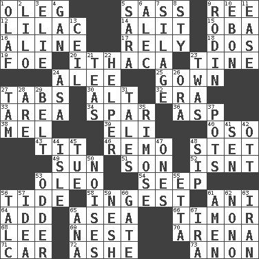 ACROSS 1. Cassini of fashion 5. Backtalk 9. To riddle 12. Pale purple color 14. Set down 15. Chief or king in Benin or Nigeria 16. Place in a line 17. Have confidence or faith in 18. Two (Sp.) 19. Enemy 20. New York city 23. Prong on a fork 24. Toward shelter 25. Bride's dress 27. Bar bills 30. Keyboard modifier key 32. Epoch 33. Length times width 34. Coast Guard woman 36. Viper 38. Cartoonist voice _ Blanc 39. Biblical high priest 40. Bear (Spanish) 43. Teat (slang) 46. San ____ (Riviera town) 48. Proofreading order 49. Player for Phoenix 51. Manchild 52. Is not 53. Margarine 54. Ooze 56. Periodic rise and fall of the sea level 58. Consume 61. Cuckoo 64. Increase 65. At sea 66. Southeast Indonesia island 68. Area sheltered from the wind 69. A home for chicks 70. Sports stadium 71. Automobile 72. American tennis player Robert 73. At once, immediately (arch.) DOWN 1. Norwegian king 2. _ and Stitch 3. Writer Wiesel 4. Separate the seeds from cotton 5. "Two Mules for Sister ____" 6. Actor Baldwin 7. Fodder prepared in a silo 8. Filthy place 9. "The Thinker" sculptor 10. Inky black, to poets 11. Relaxation 13. To provide with a ceiling 21. Afternoon social gatherings 22. Assistant 23. It was, poetically 24. White ___ sheet 26. Mouth or opening 27. Scottish cap 28. "We ___ not amused" (Victoria) 29. Waist strap 31. Stories 35. Full of chinks, cracks, or crevices 37. Plant holders 41. Elected rep. 42. Baseball player Mel 44. Small island 45. Third day of the wk. 47. Washington bills 48. Small drink 50. Annoying sounds 53. More peculiar 55. Singer James 56. Baby powder 57. The content of cognition 59. Tender 60. Yard entry 61. So be it 62. Words to Nanette 63. SW Asia republic 65. Santa ___, CA 67. Lyricist Gershwin