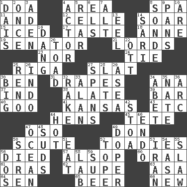 ACROSS 1. ___ good deed 4. Type of rug 8. Health resort 11. Plus 12. Cell (Danish) 14. Fly high 15. On the rocks 17. Clothes sense 18. Queen of England 1702-14 19. Legislator 21. Titled peers of a realm 23. And not 24. Neckwear 25. Capital of Latvia 27. Narrow board 30. Benjamin's nick name 31. Window treatments 34. Santa ___, CA 37. Working for oneself (abbr.) 38. Having winglike extensions 39. Tavern 40. Thick or sticky substance 41. Sunflower state 43. And so on (abbr.) 44. Coop moms 45. Wig 47. Bear (Spanish) 49. Spanish title 50. Scutum 52. Sycophants 56. Passed on 57. Columnist Joseph or Stewart 60. Spoken 61. Mouths or openings 62. Grayish beige 63. White ___ sheet 64. Elected rep. 65. Fermented drink made from hops 66. ___ Haven, CT DOWN 1. Raised platform 2. Single time 3. Arabian gulf 4. Thespian 5. Stern 6. Raised railways 7. Keyboard modifier key 8. Something which is sent 9. Baking dishes 10. "We ___ not amused" (Victoria) 13. Snakelike fish 14. Indian skirt 16. Mild oath, euphamism for damn 20. Frog relative 22. Baseball player Mel 25. Former U.S. Attorney General Janet 26. _ china 27. Connects, as a bridge 28. Allows 29. At sea 30. Massive 32. Libertine 33. ____ Jay Lerner 34. Collude with 35. Nathan's nickname 36. Curve 42. Portico 44. Being at a high temperature 46. Inside; within (prefix) 47. Sea 48. Beer foam 49. Drug addict 50. Title for a man of rank and authority 51. Ingest 52. Drink excessively 53. SW Asia republic 54. Comfort 55. Cole _ (cabbage dish) 56. Two (Sp.) 58. Experiment locale 59. Institute legal proceedings