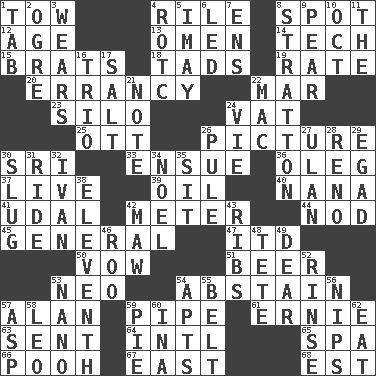 ACROSS 1. Pull behind 4. Cause heat under the collar 8. Specific locale 12. Mature 13. Presage 14. Technology 15. Naughty children 18. Small boys 19. Pace 20. Tendancy to err 22. Third mo. 23. Grain storage tower 24. Large container 25. Baseball player Mel 26. Photo 30. Indian title of respect (Mr.) 33. Follow as a consequence or result 36. Cassini of fashion 37. Moving, as bait 39. Lubricate 40. Grandmother 41. Hereditary estate 42. Distance measurement 44. Dreamland 45. Commissioned military rank 47. It would 50. Promise 51. Fermented drink made from hops 53. Modern: prefix 54. Choose not to consume 57. Actor Alda or Thicke 59. Corncob 61. Bert's buddy 63. Posted 64. International (abbr.) 65. Health resort 66. "Silly old bear" 67. Compass direction 68. Eastern Standard Time (abbr.) DOWN 1. Keyboard key 2. Legendary monster 3. Puts on (as clothing) 4. College mil. group 5. "If ____ say so..." 6. Directed 7. Followers of ems 8. Ski resort town in Vermont 9. Lightbulb-shaped fruit 10. Sep. follower 11. Definite Article 16. Musical group of three 17. Table seasoning 21. Musical sound 22. Big _ 24. Compete 26. Whine 27. ____ Bator, Mongolia 28. Western Nevada city 29. Mild oath 30. Strike heavily 31. Travel on an animal 32. _ the terrible 34. Christmas carol 35. Be seated 38. Veterans Day date 42. Opening into something insatiable 43. Chest bones 46. Friend of Pooh 48. Wig 49. Letter starter 52. Wash lightly 53. Billionth: prefix 54. Flats, for short 55. Waist strap 56. Pinches, bites 57. Viper 58. Lion 59. Sliced dessert 60. _ tizzy (2 wds.) 62. Ingest