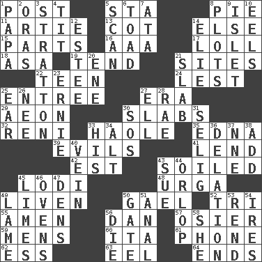 ACROSS 1. Mail 5. R.R. building 8. Sliced dessert 11. Nick name for Arthur 13. Small bed 14. Otherwise 15. Components 16. Auto club (abbr.) 17. Hang loosely or laxly 18. White ___ sheet 19. Look after 21. Locates 22. Adolescent 24. For fear that 25. Main course 27. Epoch 29. Period of immesurable duration 30. Broad, flat, thick pieces 32. Painter Guido (1575-1642) 33. White Person, in Hawaii 35. Pulitzer Prize-winning author Ferber 39. Vices 41. Grant temporary use of 42. Eastern Standard Time (abbr.) 43. Dirtied 45. Farming town in central California 48. Capital and largest city of Mongolia 49. Make or become more lively 50. Highlander 52. Three (prefix) 55. So be it 56. Daniel's nick name 57. Flexible twig of a willow tree 59. Not women's 60. Call ___ day 61. Give a jingle 62. Curvy letter 63. Snakelike fish 64. Extremities DOWN 1. Dad 2. Mouths or openings 3. Ski resort town in Vermont 4. Teat (slang) 5. Examine minutely or intensely 6. Frog relative 7. "One Day ___ Time" 8. Secret plans 9. Small island 10. Snakelike fish 12. First name in cosmetics 14. Writer Wiesel 20. Compass dir. 21. Broad, flat, thick piece 23. Bert's buddy 25. Ewer handle 26. Born 27. Pipe bend 28. Actress Charlotte 30. Mayday 31. Former Milwaukee Brewers owner Bud 33. Part of HMS, perhaps 34. The first octave above the treble staff 36. Conveyance 37. Compass dir. 38. Find the sum of 40. Distinctive style or manner 43. Institute legal proceedings 44. Fourth or lowest deck 45. Citrus fruits 46. Baking chambers 47. Cub Scout units 49. Unable to walk 50. Yard entry 51. Of or related to the anus 53. Tear apart 54. Angers 56. Expire 58. A female animal or person