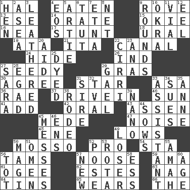 ACROSS 1. Actor Linden 4. Consumed 9. Be footloose 13. Compass dir. 14. Speak pompously 15. Migrant worker of the '30s 16. Teachers' org. 17. Check the growth or development of 18. Mountain range 19. "One Day ___ Time" 21. Call ___ day 22. Lessep's creation 24. Flintstone garb 26. Working for oneself (abbr.) 27. Full of seeds 29. Pate de foie ____ 30. Match 31. Play the lead 33. White ___ sheet 36. Actress Charlotte 37. Popular '50s hangout 40. Player for Phoenix 41. Find the sum of 42. Spoken 43. NE Netherlands city 45. Ancient Persian 47. Annoying sound 48. Compass dir. 49. Moos 50. With motion or animation 52. Adept person 54. R.R. building 56. Scottish caps 57. Trap for birds or small mammals 59. Housemaid (var.) 61. Double curve, resembling the letter S 62. _____ Park, CO 63. Tired old horse 64. Metal containers 65. Erodes 66. Definite Article DOWN 1. Layer 2. Toward the sea 3. Tough but pliablecoriaceous 4. Greek goddess of the dawn 5. Nick name for Arthur 6. Strained 7. Inactive volcano in Sicily 8. Fish or hair follower 9. Periods in a boxing match 10. Gumbo ingredient 11. Small bottle 12. Snakelike fish 20. Assistant 22. High-altitude cloud 23. Santa ___, CA 25. Colored 27. "Two Mules for Sister ____" 28. Mild oath 29. Highlander 31. Male parent of an animal 32. Federal power corp. 33. Helper 34. Takes to court 35. Queen of England 1702-14 38. Cowboy competition 39. Billionth: prefix 44. Sty mamas 45. Makes clutter 46. Followers of ems 49. Failure 50. Wise men 51. Sign of something about to happen 52. Airs 53. Roll call or roster of names 55. Wet nurse 56. Small child 57. ___ Haven, CT 58. Curvy letter 60. Mature