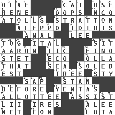 ACROSS 1. Norwegian king 5. Feline 8. Purpose 11. French philosopher Descartes 12. I made a mistake 13. Non-commissioned officer (abbr.) 14. Ringlike coral islands and reefs 17. Ski resort town in Vermont 19. City in Syria 21. Foolish or stupid persons 22. Of or related to the anus 23. Area sheltered from the wind 24. Coat; cloak 27. Slanted text style (abbr.) 29. Be seated 32. Composer Copland 34. Nervous spasm 36. Fine (Spanish) 37. Proofreading order 38. Environmental prefix 39. Rounded earthenware pot or jar 40. Not this but _ 41. Ocean 42. Having a sole or soles 43. Eastern Standard Time (abbr.) 44. Relationship diagram 46. Filthy place 47. Plant excrement 50. Comedian Laurel of Laurel & Hardy 52. Prior to 55. Gossips 57. One to whom something is allotted 59. Help 62. Cards in a Roman deck? 63. Angers 64. Toward shelter 65. Was introduced to 66. A really long time 67. Globular water bottle used in Asia DOWN 1. Mouth or opening 2. Allow 3. Small Philippine buffalo 4. Man or boy (slang) 5. Small bed 6. Showery time 7. Sadhe (variant) 8. To (old English) 9. Highlander 10. Immeasurably long periods of time 12. Bear (Spanish) 15. Soviet premier 1918-24 16. Argument over a trivial matter 18. Standoff 20. Food holders 24. Clothes sense 25. Curses 26. Relatively large 28. It is permitted: Lat. 29. Beverly of Met fame 30. An arm off of a larger body of water 31. Sycophant 33. Baseball player Mel 35. Unrefined 36. Egg _ yung 42. Theater features 45. Inactive volcano in Sicily 47. "Barney Miller" actor Jack 48. Nick name for Arthur 49. Stone: prefix 51. Relating to the nose 52. Lip ointment 53. Writer Wiesel 54. Sudden quick movement 55. It is so 56. Grain storage tower 58. Car or cant ending 60. Arrange properly for use 61. Beverage made from leaves