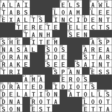 ACROSS 1. Jai _ 5. Raised railways 8. Leather borer 11. Bar bills 12. Rich soil 13. Area sheltered from the wind 14. Glorifies 17. Event 19. Cylindrical with tapered ends 21. Opts 22. Hyperbolic tangent 23. Elected rep. 24. A female animal or person 27. A distinct part 29. Cleo's killer 32. Relating to the nose 34. Distress signal 36. Type of rug 37. Northwest Algerian city 38. Binary compound 39. Play the lead 40. Libertine 41. Observe 42. Inhabitant of Heaven 43. Three (prefix) 44. Connect, as a bridge 46. Double-curved letter 47. Nanny (var.) 50. Greek god of love 52. Spoke pompously 55. Foolish or stupid persons 57. Conveyance 59. Ringlike coral islands and reefs 62. Heredity factor (abbr.) 63. Round or rotation of duties 64. Spoils 65. Male child 66. Eastern Standard Time (abbr.) 67. Singer James DOWN 1. Had dinner 2. Not strict 3. Blind as ____ 4. Small island 5. A really long time 6. Shoestrings 7. Grin 8. Actor Baldwin 9. Gone 10. Allows 12. Falsehood 15. Get behind 16. Posted 18. Lair 20. College paper 24. Derisive sound 25. Ethiopian city, capital of Harari 26. 1973 Nobel Price Winner (Physics) Leo 28. Methods 29. Nick name for Arthur 30. Seines 31. Components 33. One (Scot) 35. Oozed 36. White ___ sheet 42. Snob 45. Operatic vocal solo 47. "One Day ___ Time" 48. Distance measurement (Brit.) 49. Goodbye (Sp.) 51. Fur scarf 52. Probability 53. Western Nevada city 54. Actor Alda or Thicke 55. _ tizzy (2 wds.) 56. Narrow opening 58. Baseball player Mel 60. Car dealer's back yard 61. R.R. building