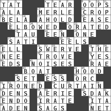 ACROSS 1. Make lace 4. Pull into pieces 8. I made a mistake 12. In the manner of 13. Haggard of country music 14. Riding implement 15. Actor Lugosi 17. Hold, grip (Informal) 18. Comfort 19. Shoved, as through a crowd 21. Spoke pompously 23. The 19th letter of the Greek alphabet 24. Car or cant ending 26. Single 27. Suttee (variant) 28. Snakelike fish 30. Pipe bend 31. Turn aside suddenly 34. Definite Article 37. Born 38. Collection of objects 39. Consenting reply 40. Begley and Asner 41. Annoying sounds 42. Actress Charlotte 43. Water vessel 44. Parka part 46. Put into a specified state 47. Curvy letter 50. The grampus (Milton) 51. Pressed 54. Window treatment 57. Cub Scout units 58. Nest on high 60. Neighbor of Neb. 62. Inside; within (prefix) 63. Feeling or showing extreme anger 64. Call ___ day 65. An important port of Yemen 66. Settles 67. Remaining after all deductions DOWN 1. Bar bill 2. Toward shelter 3. Baron Munchausen's specialties 4. Giggle 5. Eat (away) 6. Everything 7. Make new 8. Seas 9. Speak pompously 10. Introduce or present, as a question 11. Broke a traffic law 13. Opening into something insatiable 16. Blind as ____ 20. Fr. "Yes" 22. Hero or heavy, e.g. 25. Impudent aggressiveness 27. Downhill vehicle 29. Nights before holidays 30. Compass dir. 31. Portico 32. Compose 33. Greek goddess of the dawn 34. Polypeptide antibiotic 35. Froth on beer 36. Compass dir. 41. Brief written record 43. Gillaume's butler role 44. Being at a high temperature 45. Mouths or openings 46. Message 48. Strangle with an iron collar 49. Costumes for special activities 51. The content of cognition 52. Tear apart 53. Raised platform 55. Portuguese money of account (variant) 56. Nathan's nickname 59. Epoch 61. Krazy ___ of comics