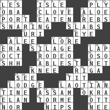 ACROSS 1. French article 4. Capri or Wight 8. Strand of rope, yarn or thread 11. Chief or king in Benin or Nigeria 12. Garlic unit 14. Medicinal plant 15. Left side of a ship or aircraft 17. Ingested 18. Confederate soldiers (slang) 19. Catching in a trap 21. Thick slices 23. RI univ. 24. Sight organ 25. Toward shelter 27. Old wives' tales, e.g. 30. Period 31. Fodder prepared in a silo 34. Pet locale 37. Sep. follower 38. Cowboy competition 39. Bear (Spanish) 40. Quiet! 41. Most capable 43. Remaining after all deductions 44. Leg joint 45. Port city in Latvia 47. Perceive with the eye 49. Teat (slang) 50. Inn 52. Of or relating to Laos or its people 56. Prong on a fork 57. Indian state 60. Gumbo ingredient 61. Enthusiasm 62. Singer Mel 63. Baseball player Mel 64. Not either 65. Pinches, bites 66. Born DOWN 1. Chops off 2. Inky black, to poets 3. "Two Mules for Sister ____" 4. Ancient Celtic tribe of eastern Britain 5. Volcanic refuse 6. Car dealer's back yard 7. First lady 8. Cadet 9. Tennis shots 10. Affirmative reply 13. Followers of ems 14. Like ___ of sunshine 16. Loyal 20. Angers 22. Area sheltered from the wind 25. Bowlike part 26. Thin strip of wood or metal 27. Dipping utensil 28. Double curve, resembling the letter S 29. Vintage cars 30. Greek goddess of the dawn 32. SW Asia republic 33. Ear part 34. Yearn 35. At sea 36. Cooking vessel 42. Musical group of three 44. Cask 46. "Tell ____ the Marines!" 47. Underwater navigation system 48. Genesis locale 49. Corrects by punishment or discipline 50. _ and Stitch 51. Erode 52. Desk light 53. Visual representation of an object 54. Johnson of "Laugh-In" 55. Nathan's nickname 56. "___ Little Indians" 58. Male offspring 59. Indian title of respect (Mr.)