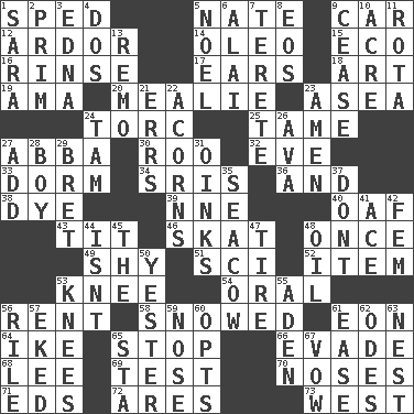 ACROSS 1. Drove too fast 5. Nathan's nickname 9. Automobile 12. Zeal 14. Margarine 15. Environmental prefix 16. Wash lightly 17. Hearing organs 18. Nonscientific branch of learning 19. Wet nurse (var.) 20. Ear of corn 23. At sea 24. Torque (variant) 25. Not wild 27. Swedish rock group 30. Friend of Pooh 32. First lady 33. Dormintory (informal) 34. Indian titles of respect 36. Plus 38. Color 39. Compass dir. 40. Clumsy lout 43. Teat (slang) 46. Three-handed card game 48. Single time 49. Like a shrinking violet 51. _-fi 52. A whole individual unit 53. Leg joint 54. Taken by mouth 56. Monthly bill 58. Overwhelmed 61. Period of immesurable duration 64. Eisenhower's nickname 65. Constrict 66. Elude 68. Area sheltered from the wind 69. Trial 70. Olfactory organs 71. Begley and Asner 72. Ancient Greek god of war 73. 270 degrees DOWN 1. "Two Mules for Sister ____" 2. Demure 3. Pulitzer Prize-winning author Ferber 4. Two (Sp.) 5. Christmas carol 6. Mountain range southwest of Kyrgyzstan 7. Cylindrical with tapered ends 8. Greek goddess of the dawn 9. Desist 10. 43,560 square feet 11. Round or rotation of duties 13. San ____ (Riviera town) 21. Blunders 22. Oak nuts 23. So be it 24. Scottish cap 26. Actress Gardner 27. Increase 28. Male child 29. Cy Young winner Saberhagen 31. Pig sounds 35. Manatee 37. Do not 41. Adept person 42. Opposite of masc. 44. Is not 45. Definite Article 47. Become fatigued 48. Lubricate 50. Last 53. Leg joints 55. An important port of Yemen 56. Cause heat under the collar 57. Made supply last 59. Sense of smell 60. Elects 61. Comfort 62. Lyric poems 63. Egg locale 65. R.R. building 67. Solemn pledge