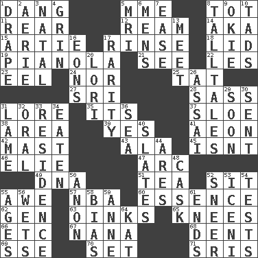 ACROSS 1. Mild oath, euphamism for damn 5. Madame (abbr.) 8. Small child 11. Tail end 12. 480, 500 or 516 sheets of paper 14. Alias (abbr.) 15. Nick name for Arthur 17. Remove soap 18. Flaplike covering 19. Player piano 21. Perceive with the eye 22. French article 23. Snakelike fish 24. Not either 25. Make lace 27. _ Lanka 28. Backtalk 31. Old wives' tales, e.g. 35. ___ a Wonderful Life 37. A type of plum 38. Length times width 39. It is so 41. Period of immesurable duration 42. Vertical spar for supporting sails 43. According to 45. Is not 46. Writer Wiesel 47. Curve 49. Heredity factor (abbr.) 51. Afternoon social gathering 52. Be seated 55. Deep reverence 57. Basketball assoc. 60. Substance 62. Commissioned mil. rank 63. Pig sounds 65. Leg joints 66. And so on (abbr.) 67. Nanny 68. Undesirable depression on a surface 69. Compass dir. 70. Put into a specified state 71. Indian titles of respect DOWN 1. Window treatment 2. Nest on high 3. Brizilian seaport 4. Amused look 5. Medical imaging device (abbr.) 6. Not women's 7. Relaxation 8. Baron Munchausen's specialties 9. Migrant worker of the '30s 10. Small boys 13. Rendezvous 16. Immeasurably long periods of time 17. Noteworthy scarcity 20. Australian parrot (variant) 26. Slender Brazilian palm 29. Within a short period 30. Posted 31. Unable to walk 32. Of the mouth 33. Dwelling 34. Eroded 36. Ocean 40. Chalkboards 44. Ancient Greek god of war 48. Keg 50. At once, immediately (arch.) 52. Contemptuous expression 53. Ancient Celtic tribe of eastern Britain 54. Trials 55. Eons 56. Soaks 58. Prejudice 59. Singer Murray 61. Conclusions 64. Krazy ___ of comics