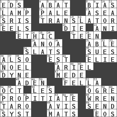 ACROSS 1. Begley and Asner 4. Blind as ____ 8. Prejudice 12. Desk light 14. Diluted with white 15. At sea 16. Indian titles of respect 17. Interpreter 20. Snakelike fish 21. Expire 22. Black tropical American cuckoo 23. Value system 27. Adolescent 29. Small Philippine buffalo 31. Competent 34. Narrow boards 35. Institutes legal proceedings 36. In addition 39. Eastern Standard Time (abbr.) 41. Writer Wiesel 42. Christmas carol 43. Satellite of Uranus 46. Centimeter-gram-second unit of force 47. Ancient Persian 48. Arabian gulf 51. Chap (slang) 54. Sep. follower 56. French article 58. Legendary monster 61. Appease 66. Songbird 67. Pacific island yam 68. Deliberation 69. Transmit 70. System (abbr.) 71. Floor coverings 72. Greek goddess of the dawn DOWN 1. Otherwise 2. Have the gumption 3. Grin 4. Fitting 5. Long, evenly shaped piece 6. Insect wing 7. Look after 8. Sound made by sheep 9. Byzantium, centuries later 10. Period of immesurable duration 11. Indian skirt 13. Inconspicuous attention getter 18. Be seated 19. Area sheltered from the wind 24. Actor Linden 25. _ tizzy (2 wds.) 26. ____ d'Azur (French Riviera) 28. Artist's stand 30. Indian state 32. Luau accessory 33. Compass dir. 34. Having a sole or soles 36. Also 37. Myrna of the movies 38. Elected representatives 40. Unclean, religiously 44. Binary compound 45. Snakelike fish 49. Connecticut Ivy Leaguer 50. Fish or hair follower 52. Moos 53. Match 54. Chooses 55. Supercomputer manufacturer 57. Thailand, formerly 59. Western Nevada city 60. Extremities 62. Plant holder 63. Actress Gardner 64. Teat (slang) 65. Double-curved letter