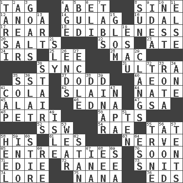 ACROSS 1. Label 4. Collude with 8. Trig term 12. Small Philippine buffalo 14. Russian prison camp 16. Allodial 17. Tail end 18. The property of being fit to eat 20. Table seasonings 22. Distress signal 23. Had dinner 24. Big collection agency 25. Area sheltered from the wind 28. Apple computer (short form) 30. Synchronize (abbr.) 31. Extreme 35. Fast jet (abbr.) 37. Texas town _ City 40. Period of immesurable duration 41. Root beer relative 42. Killed 44. Nathan's nickname 45. Mountain range southwest of Kyrgyzstan 46. Pulitzer Prize-winning author Ferber 47. Girls' org. (abbr.) 48. _ dish (used to culture cells) 50. Tenement units (abbr.) 52. Compass dir. 54. Actress Charlotte 55. Make lace 58. Part of HMS, perhaps 61. French article 63. Boldness 65. Pleas 70. Within a short period 71. Singer Brickell 72. The wife of a rajah (variant) 73. In a ____ (agitated or irritated) 74. Old wives' tales, e.g. 75. Nanny 76. Begley and Asner DOWN 1. Tarsus (plural) 2. Approach 3. Finish lines 4. Personal question 5. Partially opened flower 6. Connecticut Ivy Leaguer 7. Bar bills 8. Player for Phoenix 9. It may be bright or harebrained 10. Political cartoonist Thomas 11. Otherwise 13. Nonscientific branch of learning 15. Take by theft 19. Son of Isaac 21. Roguish 26. Extremities 27. Learning spot: Fr. 29. Rings like a ship's bell 30. Flight of steps 32. Beverages made from leaves 33. Roll call or roster of names 34. A saturated hydrocarbon 35. Flatfish 36. Narrow board 38. Male parent 39. Middle Eastern gold or silver currency 41. Head covering 43. California wine valley 49. Small island 51. "___ Little Indians" 53. Put on (as clothing) 55. Marketplace scale 56. Shun 57. Portable shelters 58. Person who is morally reprehensible 59. _ china 60. Commotion 62. Comedian Laurel of Laurel & Hardy 64. Double-curved letter 66. To sift 67. _ tizzy (2 wds.) 68. Car or cant ending 69. Ocean