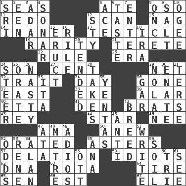 ACROSS 1. Oceans 5. Had dinner 8. Bear (Spanish) 11. Make new 12. Examine hastily 13. Tired old horse 14. Sillier 17. A testis 19. Noteworthy scarcity 21. Cigar-shaped 22. Governing power 23. Period 24. Male child 27. Penny 29. Fish or hair follower 32. Distinguishing feature 34. 24 hours 36. Went 37. 90 degrees 38. Make supply last 39. Having or resembling wings 40. Singer James 41. Lair 42. Naughty children 43. Marina Del _, California 44. Play the lead 46. Born 47. Nursemaid (var.) 50. Afresh 52. Declaimed 55. Michaelmas daisies 57. Conveyance 59. Foolish or stupid persons 62. Heredity factor (abbr.) 63. Round or rotation of duties 64. Hoop that covers a wheel 65. Elected rep. 66. Eastern Standard Time (abbr.) 67. Writer Wiesel DOWN 1. _ Lanka 2. Car or cant ending 3. The sixth month of the Jewish calendar 4. Echolocation 5. Adept person 6. Clothes sense 7. Keyboard key 8. Single time 9. Table seasoning 10. Double curve, resembling the letter S 12. Filthy place 15. Spew [out] 16. Cause heat under the collar 18. Lyricist Gershwin 20. Looked after 24. Bull 25. Speak pompously 26. Difficult 28. Proceeds 29. Pitcher Ryan 30. Related on the mother's side 31. Laconic 33. Call ___ day 35. Gossips 36. Slender fish 42. A special lineage 45. Opposed to 47. _ moment's notice (2 wds.) 48. Distance measurement (Brit.) 49. Goodbye (Sp.) 51. Compose 52. Likelihood 53. French philosopher Descartes 54. Actor Alda or Thicke 55. Santa ___, CA 56. The visible part of the earth's surface 58. Baseball player Mel 60. Three (prefix) 61. Perceive with the eye