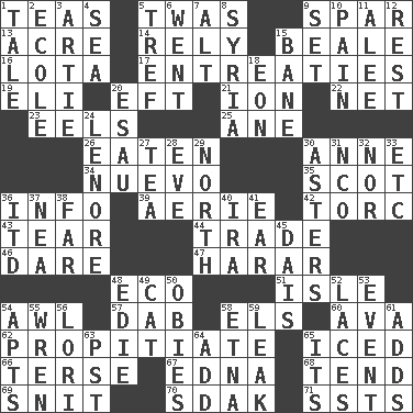 ACROSS 1. Afternoon social gatherings 5. It was, poetically 9. Coast Guard woman 13. Measure of real estate 14. Have trust in 15. Calif. Air Force Base 16. Globular water bottle used in Asia 17. Pleas 19. Biblical high priest 20. Bank Draft (abbr.) 21. Electrically charged atom 22. Fish or hair follower 23. Snakelike fish 25. A saturated hydrocarbon 26. Ingested 30. Singer Murray 34. New (sp.) 35. Native of Scotland 36. Information 39. Nest on high 42. Torque (variant) 43. Separate forcefully 44. Exchange 46. Have the gumption 47. Ethiopian city, capital of Harari 48. Environmental prefix 51. Capri or Wight 54. Leather borer 57. Pat or tap gently 58. Raised railways 60. Actress Gardner 62. Conciliate 65. On the rocks 66. Laconic 67. Pulitzer Prize-winning author Ferber 68. Be inclined (to) 69. In a ____ (agitated or irritated) 70. Neighbor of Neb. 71. Fast planes DOWN 1. Falsehood 2. Learning spot: Fr. 3. Nick name for Arthur 4. Ocean 5. Not kosher 6. Left 7. Keyboard modifier key 8. Damascus' land 9. Put into a specified state 10. Ache 11. Toward shelter 12. State of inaction 15. Object of repulsion 18. A really long time 20. He sold his birthright 24. Poe poem 27. Beverage made from leaves 28. First lady 29. Compass direction 30. Michaelmas daisies 31. Non-commissioned officer (abbr.) 32. Not either 33. And so on (abbr.) 36. It would 37. Teachers' org. 38. Distant 40. Lyricist Gershwin 41. Hearing organ 45. Raised platform 48. Singer Brickell 49. Feline 50. Off-Broadway awards 52. Shoestrings 53. Happening 54. Tenement units (abbr.) 55. Songbird 56. Australian parrot (variant) 58. Inactive volcano in Sicily 59. Path through which fluid escapes 61. Does sums 63. Pacific Standard Time (abbr.) 64. Say or write further 65. ___ a Wonderful Life