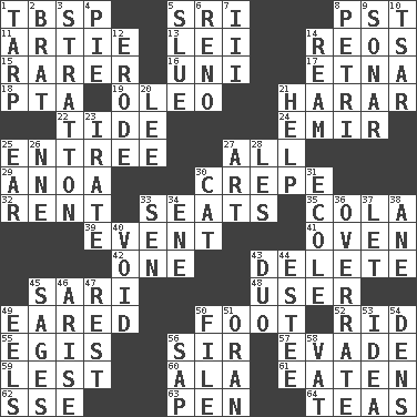ACROSS 1. Cook's measure (abbr.) 5. Indian title of respect (Mr.) 8. Pacific Standard Time (abbr.) 11. Nick name for Arthur 13. Luau accessory 14. Vintage cars 15. Less widely known 16. University (slang) 17. Inactive volcano in Sicily 18. Parent Teacher Association (abbr.) 19. Margarine 21. Ethiopian city, capital of Harari 22. Event that recurs at intervals 24. Arab leader 25. Main course 27. Everything 29. Small Philippine buffalo 30. Streamer paper 32. Monthly bill 33. Theater features 35. Root beer relative 39. Happening 41. Baking chamber 42. Single 43. Erase 45. Indian skirt 48. One who makes use of a thing 49. Having ears or earlike features 50. 12 inches 52. To free from 55. The front part of a cuirass 56. Title for a knight 57. Dodge 59. For fear that 60. According to 61. Eroded 62. Compass dir. 63. Animal enclosure 64. Afternoon social gatherings DOWN 1. Canvas cover 2. Naughty child 3. Ski resort town in Vermont 4. Sliced dessert 5. Turn sharply 6. Former U.S. Attorney General Janet 7. One more than two 8. _ dish (used to culture cells) 9. Underwater navigation system 10. Russian ruler of old 12. Eat (away) 14. 480, 500 or 516 sheets of paper 20. Area sheltered from the wind 21. Aid 23. Feeling or showing extreme anger 25. Ewer handle 26. Compass dir. 27. Tate display 28. French article 30. Feline 31. Learning spot: Fr. 33. Elected rep. 34. Compass dir. 36. Make much ado about nothing 37. Allow 38. One (Scot) 40. Lacking any legal or binding force 43. Superhero pair 44. First name in cosmetics 45. Gurus 46. Ascend 47. Relief 49. Snakelike fish 50. Do some clerical work 51. Northwest Algerian city 53. The main thing one is thinking about 54. Hiding places for outlaws 56. Plant excrement 58. Large container