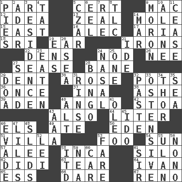 ACROSS 1. Piece 5. Certainty 9. Big _ 12. The main thing one is thinking about 13. Ardor 14. Undercover agent 15. Compass direction 16. Actor Baldwin 17. Roberta Peters solo 18. _ Lanka 19. Hearing organ 21. Removes the wrinkles 22. Cub Scout units 24. Dreamland 26. Born 27. Gospel singer Marvin 28. Object of repulsion 29. Undesirable depression on a surface 30. Came up 32. Plant holders 36. At one time in the past 37. _ tizzy (2 wds.) 38. American tennis player Robert 39. Arabian gulf 40. White American of non-Hispanic descent 42. Portico 43. In addition 44. 61 cubic inches 46. Raised railways 49. Had dinner 50. Locale of original sin 51. Country residence 53. Egg _ yung 54. Player for Phoenix 57. Toward shelter 58. South American Indian 61. Grain storage tower 62. "You Light Up My Life" star Conn 63. Pull apart 64. _ the terrible 65. Curvy letter 66. Have the gumption 67. Western Nevada city DOWN 1. Sliced desserts 2. The sixth month of the Jewish calendar 3. Home 4. Make lace 5. Russian ruler of old 6. Snakelike fish 7. Actress Charlotte 8. Affectionate concern, for short 9. Person of subnormal intelligence 10. Place in a line 11. Stop 14. Third mo. 19. Followers of ems 20. At sea 21. Binary compound 23. Consumed 24. Relating to the nose 25. Single 27. Transmit 28. Beat drum 29. ___ good deed 31. Remove soap 32. Thick mixture 33. Clearly or manifestly demonstrative 34. Son of Odin 35. Ocean 40. The first octave above the treble staff 41. Margarine 43. American Automobile Association (abbr.) 45. Wedding promise 46. Dodge 47. Ms. Damita and namesakes 48. Bobsleighs 52. Luau accessory 53. Conductor's collection 55. ____ Bator, Mongolia 56. Words to Nanette 58. It would 59. Teachers' org. 60. Automobile 61. Title for a knight