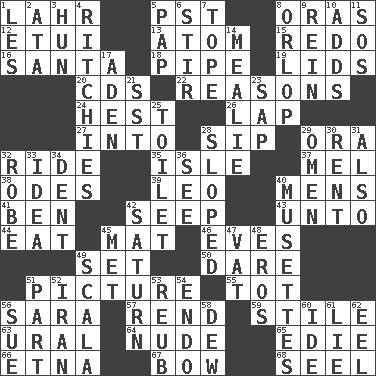 ACROSS 1. Cowardly lion portrayer 5. Pacific Standard Time (abbr.) 8. Mouths or openings 12. Needle holder 13. Tiny particle 15. Redecorate 16. Before Barbara or Clara 18. Corncob 19. Flaplike coverings 20. Music discs 22. Thinks logically 24. Behest 26. Pet locale 27. To the inside or interior of 28. Small drink 29. Mouth or opening 32. Travel on an animal 35. Capri or Wight 37. Cartoonist voice _ Blanc 38. Lyric poems 39. Lion 40. Not women's 41. Benjamin's nick name 42. Ooze 43. To (old English) 44. Ingest 45. Floor covering 46. Nights before holidays 49. Arrange properly for use 50. Have the gumption 51. Photo 55. Small child 56. "Two Mules for Sister ____" 57. Tear apart 59. Vertical member of a panel or frame 63. Mountain range 64. Naked 65. Singer Brickell 66. Inactive volcano in Sicily 67. Ribbon knot 68. Sew up the eyelids of hawks and falcons DOWN 1. French article 2. "One Day ___ Time" 3. Attila the _ 4. Actors Guy, Robert Welles, and Clint 5. Infant food 6. Use a spoon 7. Drink excessively 8. Fourth or lowest deck 9. It's straight from the horse's mouth 10. Does sums 11. Distress signal 14. Ear of corn 17. An important port of Yemen 21. Fast jet (abbr.) 23. Plant excrement 25. Rest room 28. Inclined 29. Sign of things to come 30. Monthly bill 31. In addition 32. Loose flowing garment 33. The content of cognition 34. Undesirable depression on a surface 36. Perceive with the eye 40. French bagpipes 42. Titan orbits this 45. Was introduced to 47. Large container 48. Greek god of love 49. Any of the three canals of the cochlea 51. Role in a play 52. SW Asia republic 53. Reuben's nickname 54. Inside; within (prefix) 56. Institute legal proceedings 58. Morning condensation 60. Binary compound 61. Falsehood 62. Snakelike fish