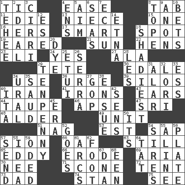 ACROSS 1. Nervous spasm 4. Relaxation 8. Keyboard key 11. Singer Brickell 13. Sibling's daughter 15. Single 16. Possessive pronoun 17. Don Adams' spy role 18. Specific locale 19. Having ears or earlike features 21. Player for Phoenix 22. Coop moms 23. Connecticut Ivy Leaguer 24. It is so 27. According to 29. Wig 30. Peak District village in England 34. Purpose 36. Goad 39. Grain storage towers 40. SW Asia republic 41. Removes the wrinkles 43. Hearing organs 44. Grayish beige 46. Domed church section 47. Indian title of respect (Mr.) 48. Tree or shrub in the Birch family 49. A single undivided whole 51. Tired old horse 53. Eastern Standard Time (abbr.) 54. Plant excrement 57. The Jewish people; Israel 60. Clumsy lout 63. Not moving 65. Whirlpool 66. Wear away 69. Operatic vocal solo 70. Born 71. Biscuitlike quick bread 72. Portable shelter 73. June honoree 74. Comedian Laurel of Laurel & Hardy 75. Observe DOWN 1. Giggle 2. Perfect 3. High-altitude cloud 4. Followers of ems 5. Direct toward a target or goal 6. Oceans 7. Shade of tan 8. Drink excessively 9. Soon (poet.) 10. Antes 12. Compass dir. 14. Inactive volcano in Sicily 18. Most dark, concealed or hidden 20. Color 25. Needle case 26. Father Junipero _ 28. French article 29. 3-inch nail 31. Having or resembling wings 32. Australian parrot (variant) 33. Curvy letter 34. Mountain range 35. Saudi Arabian king (1953-1964) 37. Republican Party 38. Follow as a consequence or result 40. Call ___ day 42. Elected reps. 45. Period 50. It is 52. Moves 54. Fathers 55. Place in a line 56. Food holder 57. Post 58. The content of cognition 59. Wrote a lyric poem 61. Arches 62. Pick up the tab 64. Make lace 67. Heredity factor (abbr.) 68. Car or cant ending