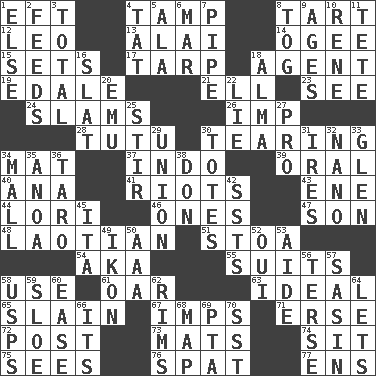 ACROSS 1. Newt 4. Pack (down) 8. Small pie 12. Lion 13. Jai _ 14. Double curve, resembling the letter S 15. Arranges properly for use 17. Canvas cover 18. Representative 19. Peak District village in England 21. Pipe bend 23. Perceive with the eye 24. Hits or strikes with great force 26. Mischievous child 28. Ballerina skirt 30. Lacerating 34. Floor protector 37. _ china 39. Relating to the mouth 40. Santa ___, CA 41. Debaucheries 43. Compass dir. 44. Australian parrot (variant) 46. Washington bills 47. Male offspring 48. Of or relating to Laos or its people 51. Portico 54. Alias (abbr.) 55. Costumes for special activities 58. Purpose 61. Boat paddle 63. Perfect 65. Killed 67. Naughty children 71. Celtic language 72. Mail 73. Floor coverings 74. Be seated 75. Observes 76. Petty quarrel 77. Followers of ems DOWN 1. Otherwise 2. Eats 3. Add up to 4. Make lace 5. According to 6. Impair 7. Corncob 8. Coat; cloak 9. Matures 10. French philosopher Descartes 11. False hair 16. Narrow board 18. _ mater 20. Australian flightless bird 22. Falsehood 25. Tumult 27. Adept person 29. The state of being joined or united 30. Hauls 31. Angers 32. Billionth: prefix 33. Small, secluded valley 34. Promenade 35. Small Philippine buffalo 36. Pacific island yam 38. Spanish title 42. Fast planes 45. Call ___ day 49. Image 50. American Automobile Association (abbr.) 52. Fr. "Yes" 53. Helper 56. Laconic 57. Indian antelope 58. United States Postal Service (abbr.) 59. _ gin 60. Relaxation 62. Basketball hoops 64. Allows 66. It is 68. Atlas unit 69. Parent Teacher Association (abbr.) 70. Fast jet (abbr.)