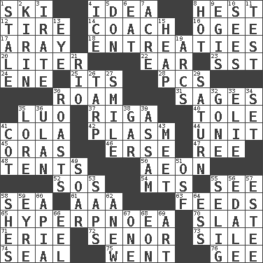 ACROSS 1. What Jean-Claude Killy likes to do 4. It may be bright or harebrained 8. Command 12. Hoop that covers a wheel 14. Team commander 16. Double curve, resembling the letter S 17. Like ___ of sunshine 18. Pleas 20. 61 cubic inches 22. Hearing organ 23. Fast jet (abbr.) 24. Compass dir. 25. ___ a Wonderful Life 28. Personal Computers (abbr.) 30. Wander aimlessly 31. Gurus 35. Nilotic language 37. Capital of Latvia 40. Lacquered or enameled metalware 41. Root beer relative 42. Suffix with ecto or cyto 44. A single undivided whole 45. Mouths or openings 46. Celtic language 47. To riddle 48. Portable shelters 50. Period of immesurable duration 52. Distress signal 54. Mountains (abbr.) 55. Perceive with the eye 58. Ocean 61. American Automobile Association (abbr.) 63. Eats 65. Abnormally rapid or deep breathing 70. Narrow board 71. 4th largest of the Great Lakes 72. Sir (Sp.) 73. Drop; flow; fall 74. Lick closed 75. Gone 76. Turn to the right DOWN 1. Lacking originality or spontaneity 2. Japanese brewing company 3. Feeling or showing extreme anger 4. Frozen water 5. Spanish title 6. Consume 7. Measure of real estate 8. Being at a high temperature 9. The front part of a cuirass 10. Observes 11. Trial 13. Sight organ 15. Pile 19. Curves 21. _ de Janeiro 26. Canvas cover 27. Grin 29. Titan orbits this 30. Cooks with dry heat, as in an oven 32. Went 33. Writer Wiesel 34. Put into a specified state 35. Old wives' tales, e.g. 36. Uhlan (variant) 38. Slender fish 39. Indian state 41. Small bed 43. Rendezvous 49. Fly high 51. Order of Saint Francis (abbr.) 53. Plant excrements 55. Major League Baseball Commissioner Bud 56. Peak District village in England 57. First name in cosmetics 58. "______ My Girl" (Turtles hit) 59. Jane of fiction 60. Capital of Western Samoa 62. Afresh 64. Double-curved letter 66. Snakelike fish 67. Single 68. Period of immesurable duration 69. Tate display