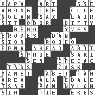 ACROSS 1. Dad 5. Tate display 8. Compass dir. 11. Amid 13. Area sheltered from the wind 14. A slight indication 15. Pitcher Ryan 16. Saxophone 17. Den 18. Be seated 19. Scent 21. Simple song 22. San ____ (Riviera town) 24. Jacques Cousteau's middle name 25. Eats (away) 27. Daniel's nick name 29. The Jewish people; Israel 30. Cowboy competition 32. Pulitzer Prize-winning author Ferber 33. Forward in time 35. "This won't hurt ____!" 39. Disorder 41. Indian skirt 42. Elected rep. 43. Medicinal drug used to evoke vomiting 45. Small boys 48. Keg 49. French painter Edouard 50. Collude with 52. Scottish cap 55. Length times width 56. Chicken ___ king 57. Peak District village in England 59. Russian ruler of old 60. Baking dish 61. High-strength synthetic material 62. Title for a knight 63. Make a knot 64. Makes supply last DOWN 1. Baking dishes 2. Mine, in Marseilles 3. Characterized by complete cowardliness 4. Santa ___, CA 5. In addition 6. Posterior 7. John Ritter's dad 8. Schedule 9. Costumes for special activities 10. Suggestive of the supernatural 12. Dwarf 14. 154 in Roman numerals 20. Two (Sp.) 21. Unit of force 23. Ferber et al. 25. Compass dir. 26. To free from 27. ___ good deed 28. Increase 30. Portuguese money of account (variant) 31. Fertile tracts in a desert 33. "We ___ not amused" (Victoria) 34. Attila the _ 36. Sass 37. Retirement account (abbr.) 38. Nervous spasm 40. Inconspicuous attention getter 43. Frozen water 44. Eucharist need 45. Tarsus (plural) 46. Approach 47. Letter starter 49. Floor coverings 50. Jai ____ 51. Object of repulsion 53. Medicinal plant 54. Not women's 56. Fitting 58. Color