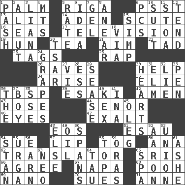 ACROSS 1. Inside of hand 5. Port city in Latvia 9. Inconspicuous attention getter 13. Came down and settled, as after flight 14. Arabian gulf 15. Turtle shell scale 16. Oceans 17. Household entertainment appliance 19. Attila the _ 20. Beverage made from leaves 21. Direct toward a target or goal 22. Small amount or degree 23. Labels 25. Reproach for some lapse or misdeed 26. All-night dance parties 30. Assist 34. Ascend 35. Writer Wiesel 36. Cook's measure (abbr.) 39. 1973 Nobel Price Winner (Physics) Leo 42. So be it 43. Stockings 44. Sir (Sp.) 46. Sight organs 47. Honor 48. Greek goddess of the dawn 51. He sold his birthright 54. Take to court 57. Mouth edge 58. Coat; cloak 60. Santa ___, CA 62. Interpreter 65. Indian titles of respect 66. Match 67. California wine valley 68. "Silly old bear" 69. Billionth: prefix 70. Institutes legal proceedings 71. Singer Murray DOWN 1. Romantic infatuation 2. Native American of Southwest Alaska 3. Woody, climbing, usually tropical plant 4. Mountains (abbr.) 5. Pace 6. The content of cognition 7. Set 8. Approach 9. Personal Computers (abbr.) 10. Costume for a special activity 11. Portico 12. Be inclined (to) 15. Simple or foolish person 18. By way of 20. Russian ruler of old 24. Raisin fruits 27. Compete 28. Curvy letter 29. Gospel singer Marvin 30. Centers 31. Shade tree 32. Untruth 33. Fenced enclosure 36. Definite Article 37. Male child 38. Compass dir. 40. A weed 41. _ tizzy (2 wds.) 45. Cassini of fashion 48. Otherwise 49. Lubricate 50. Connects, as a bridge 52. Composer Copland 53. The state of being joined or united 54. Comedian Laurel of Laurel & Hardy 55. Capital and largest city of Mongolia 56. Merit 58. Drink excessively 59. Mouths or openings 61. American tennis player Robert 63. Modern: prefix 64. The 19th letter of the Greek alphabet 65. Health resort