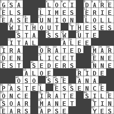 ACROSS 1. Girls' org. (abbr.) 4. Locales 8. Have the gumption 12. Raised railways 13. Citrus fruits 14. 4th largest of the Great Lakes 15. Relaxation 17. The state of being joined or united 18. Hang loosely or laxly 19. Sans 21. College papers 23. R.R. building 24. Compass dir. 26. Shoshoni 27. Slanted text style (abbr.) 28. Toward shelter 30. Lyricist Gershwin 31. Declaimed 34. Third mo. 37. Lair 38. It is permitted: Lat. 39. Compass dir. 40. Eastern Standard Time (abbr.) 41. Spring feasts 42. Compass dir. 43. Medicinal plant 44. Travel on an animal 46. Bear (Spanish) 47. Compass dir. 50. Santa ___, CA 51. Soft color 54. Core 57. Single time 58. Feeling or showing extreme anger 60. Drop; flow; fall 62. Fly high 63. French painter Edouard 64. Shallow baking pan 65. Hearing organs 66. Domed church section 67. Affirmative reply DOWN 1. Turn to the right 2. Cole _ (cabbage dish) 3. Aide 4. "_ and Lucy" (Charlie Brown theme song) 5. Leaves out 6. Corporate head (abbr.) 7. Is not 8. Erase 9. Came up 10. Cause heat under the collar 11. Snakelike fish 13. Nilotic language 16. Singer James 20. Actor Linden 22. Became colored 25. Wetness 27. Angers 29. Allows 30. Binary compound 31. Margarine 32. Amusement-park features 33. Adept person 34. Ananias' fault 35. Singer Murray 36. To sift 41. A type of plum 43. Michaelmas daisies 44. Actress Charlotte 45. Taverns 46. Motion picture award 48. Seines 49. First name in cosmetics 51. Airs 52. Small Philippine buffalo 53. Pale green bean 55. Put into a specified state 56. Writer Wiesel 59. Hit sharply and swiftly 61. Followers of ems