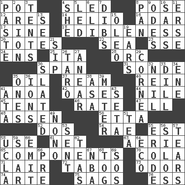 ACROSS 1. Cooking vessel 4. Downhill vehicle 8. Introduce or present, as a question 12. Ancient Greek god of war 14. Sun: prefix 16. The sixth month of the Jewish calendar 17. Trig term 18. The property of being fit to eat 20. Lugs 22. Ocean 23. Compass dir. 24. Followers of ems 25. Call ___ day 28. The grampus (Milton) 30. Connect, as a bridge 31. Something which is sent 35. Lubricate 37. 480, 500 or 516 sheets of paper 40. It's straight from the horse's mouth 41. Small Philippine buffalo 42. Fertile tracts in a desert 44. Mediterranean tributary 45. Portable shelter 46. Assign a rank or rating to 47. Pipe bend 48. NE Netherlands city 50. Singer James 52. Two (Sp.) 54. Actress Charlotte 55. Eastern Standard Time (abbr.) 58. Purpose 61. Remaining after all deductions 63. Nest on high 65. Pieces 70. Root beer relative 71. Den 72. Off limits 73. Scent 74. Johnson of "Laugh-In" 75. Sinks 76. Curvy letter DOWN 1. Thick mixture 2. Greek mythologigal hunter 3. Portable shelters 4. A female animal or person 5. Directed 6. Connecticut Ivy Leaguer 7. Rights 8. Baking dish 9. Lyric poems 10. Backtalk 11. Celtic language 13. Observe 15. Butter sub 19. Hearing organs 21. Small drink 26. Pacific island yam 27. Approach 29. Pupil covering 30. Scheduled 32. Famous astronaut Armstrong 33. Deli pickle 34. Compass dir. 35. Washington bills 36. Charged particles 38. White ___ sheet 39. Distance measurement 41. "One Day ___ Time" 43. Bristle 49. Words to Nanette 51. Beverage made from leaves 53. Emitted 55. Eat (away) 56. Grain storage towers 57. Lacerates 58. Southern CA. univ. 59. Fly high 60. Give off 62. Beverages made from leaves 64. Environmental prefix 66. Before (prefix) 67. Basketball assoc. 68. Coat; cloak 69. Distress signal