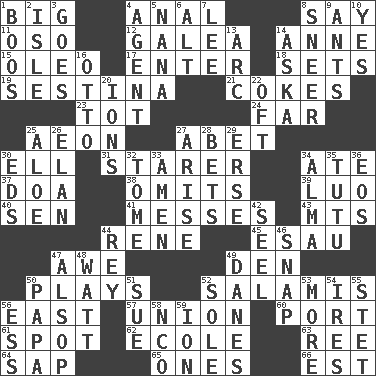 ACROSS 1. Massive 4. Of or related to the anus 8. Declare 11. Bear (Spanish) 12. An organ shaped like a helmet 14. Singer Murray 15. Butter sub 17. Keyboard key 18. Puts into a specified state 19. French poetic form 21. Popular sodas 23. Small child 24. At a great distance 25. Period of immesurable duration 27. Collude with 30. Pipe bend 31. A viewer who gazes fixedly 34. Had dinner 37. ___ good deed 38. Leaves out 39. Nilotic language 40. Elected rep. 41. Makes clutter 43. Mountains (abbr.) 44. French philosopher Descartes 45. Son of Isaac 47. Deep reverence 49. Lair 50. Romps 52. Deli grouping 56. Compass direction 57. The state of being joined or united 60. Sweet dark-red dessert wine 61. Blemish 62. Learning spot: Fr. 63. To separate or throw off 64. Plant excrement 65. Singles 66. Eastern Standard Time (abbr.) DOWN 1. Scornful sounds 2. Capri or Wight 3. Leaves 4. Representative 5. Grandmother 6. Keyboard modifier key 7. Area sheltered from the wind 8. Contemptuous expression 9. Pismires 10. Consenting reply 13. Curve 14. "____ silly question..." 16. "Beetle Bailey" pooch 20. Charged atoms 22. Often (poetically) 25. Medicinal plant 26. Liveliness 27. Ascend 28. Wagers 29. Celtic language 30. Begley and Asner 32. Heavy book 33. So be it 34. _ mater 35. Ballerina skirt 36. Greek goddess of the dawn 42. Stitch closed the eyes of (a falcon) 44. Marina Del _, California 46. Fastener 47. Columnist Joseph or Stewart 48. Electrical Unit 49. Natives or inhabitants of Denmark 50. Dad 51. Take to court 52. Flatfish 53. Greater amount 54. Angers 55. Proofreading order 56. Double-curved letter 58. Non-commissioned officer (abbr.) 59. Electrically charged atom