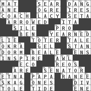 ACROSS 1. Floor covering 4. Dry up 8. Mild oath, euphamism for damn 12. One (Scot) 13. Legendary monster 14. Angers 15. Team commander 18. Made of lace 19. Stalk of a moss capsule 20. Moved like an arrow 22. Call ___ day 23. Filth; sediment 24. Adept person 25. Benjamin's nick name 26. Felt deep pity or tenderness 30. Whopper 33. Carrier 36. Lie 37. Gumbo ingredient 39. Set 40. Comedian Laurel of Laurel & Hardy 41. Dormintory (informal) 42. Memphis, Tenn. Street 44. Followers of ems 45. Stimulate to action 47. Leather borer 50. Environmental prefix 51. Vintage cars 53. "We ___ not amused" (Victoria) 54. Legislator 57. Inactive volcano in Sicily 59. Dad 61. Indian princess (variant) 63. Heroin 64. Singles 65. HTML Container Element 66. Lacquered or enameled metalware 67. Event that recurs at intervals 68. Compass dir. DOWN 1. Apple computer (short form) 2. Small Philippine buffalo 3. Lacerates 4. Not divided or shared with others 5. Mild oath 6. Curve 7. Marina Del _, California 8. What propaganda does 9. Length times width 10. Remaining after all deductions 11. Girls' org. (abbr.) 16. Baby bed with high sides 17. Opening into or through something 21. Left 22. Lyricist Gershwin 24. For each 26. Shout 27. Nathan's nickname 28. Style 29. Lairs 30. Farming town in central California 31. Visual representation of an object 32. Blunders 34. Double curve, resembling the letter S 35. Afternoon social gathering 38. Electrical Measurement 42. Sis' sibling 43. Merit 46. Frozen water 48. Erode 49. Globular water bottle used in Asia 52. Something which is sent 53. Of or related to the anus 54. Broke a traffic law 55. Relaxation 56. It's straight from the horse's mouth 57. Eastern Standard Time (abbr.) 58. Ring climax 59. Plant holder 60. Cuckoo 62. Night before a holiday
