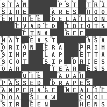 ACROSS 1. Comedian Laurel of Laurel & Hardy 5. Pacific Standard Time (abbr.) 8. Three (prefix) 11. Male parent of an animal 12. Ancient Greek god of war 13. Friend of Pooh 14. Main course 17. Conveyance 19. Dodged 21. Foolish or stupid persons 22. Inactive volcano in Sicily 23. Turn to the right 24. Floor covering 27. Compass direction 29. White ___ sheet 32. Greek mythologigal hunter 34. Period 36. Demure 37. Simple or foolish person 38. Infant locale 39. Singer James 40. Highlander 41. Small drink 42. Frees from moisture 43. Boat paddle 44. Pull apart 46. Curvy letter 47. Shoshoni 50. The sixth month of the Jewish calendar 52. Went by 55. Window treatments 57. Electrical Measurement 59. Ear of corn 62. ___ good deed 63. Cole _ (cabbage dish) 64. Calm and collected 65. Title for a knight 66. Car or cant ending 67. Coop moms DOWN 1. Compass dir. 2. Shallow baking pan 3. Johnson of "Laugh-In" 4. Impudent aggressiveness 5. Before (prefix) 6. Former Milwaukee Brewers owner Bud 7. Sadhe (variant) 8. Musical group of three 9. Carrot, for example 10. Charged atoms 12. Increase 15. Eroded 16. Pulitzer Prize-winning author Ferber 18. Make a knot 20. Artist's stands 24. With motion or animation 25. N. Chile seaport 26. Southeast Indonesia island 28. Distinguishing feature 29. Nick name for Arthur 30. Locates 31. Collect or gather 33. Elect 35. Seem 36. For each 42. Window treatment 45. First of billions? 47. Purpose 48. Laconic 49. Peak District village in England 51. Arrive at 52. Writing tablets 53. Mine, in Marseilles 54. Practice fight 55. Morning condensation 56. _ gin 58. Separate the seeds from cotton 60. Electrically charged atom 61. Raised railways