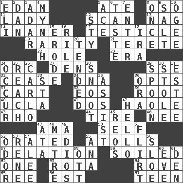 ACROSS 1. Dutch treat 5. Had dinner 8. Bear (Spanish) 11. Kenny Rogers chart-topper in '80 12. Examine minutely or intensely 13. Tired old horse 14. More lacking in sense or substance 17. A testis 19. Noteworthy scarcity 21. Cylindrical with tapered ends 22. Hollow 23. Epoch 24. The grampus (Milton) 27. Hiding places for outlaws 29. Compass dir. 32. Desist 34. Heredity factor (abbr.) 36. Elects 37. Heavy open wagon 38. Greek goddess of the dawn 39. Carrot, for example 40. Southern CA. univ. 41. Two (Sp.) 42. White Person, in Hawaii 43. 17th letter of the Greek alphabet 44. Hoop that covers a wheel 46. Born 47. Nanny (var.) 50. Itself 52. Declaimed 55. Ringlike coral islands and reefs 57. Conveyance 59. Dirtied 62. Single 63. Round or rotation of duties 64. Be footloose 65. To riddle 66. Eastern Standard Time (abbr.) 67. Adolescent DOWN 1. Biblical high priest 2. Daniel's nick name 3. The sixth month of the Jewish calendar 4. Non-adult bird? 5. Adept person 6. Clothes sense 7. Keyboard key 8. At one time in the past 9. Table seasoning 10. Double curve, resembling the letter S 12. Filthy place 15. Wear away 16. Cause heat under the collar 18. Retirement account (abbr.) 20. Watched over 24. Come to pass 25. Arrive at 26. Monte _, Las Vegas Hotel/Casino 28. Snout, nose 29. Soup utensil 30. Fur scarf 31. First name in cosmetics 33. R.R. building 35. Aid 36. Mouth or opening 42. Phone greeting 45. Vintage cars 47. "One Day ___ Time" 48. Distance measurement (Brit.) 49. Goodbye (Sp.) 51. Seductive woman who exploits men 52. Aroma 53. French philosopher Descartes 54. Toward shelter 55. Santa ___, CA 56. A type of plum 58. Baseball player Mel 60. Night before a holiday 61. Lair