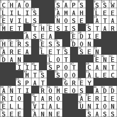 ACROSS 1. US Secretary of Labor Elaine L. _ 5. Plant excrements 9. Compass dir. 12. Ms. Damita and namesakes 14. Nursemaid 15. Area sheltered from the wind 16. Vices 17. Characteristic smell of wine 18. _ moment's notice (2 wds.) 19. Was introduced to 20. College paper 23. Play the lead 24. Toward the sea 25. Singer Brickell 27. Possessive pronoun 30. Double-curved letter 32. Spanish title 33. Type of rug 34. Allows 36. Elected rep. 38. One of the 12 tribes of Israel 39. Car dealer's back yard 40. Compass dir. 43. One more than two 46. Blemish 48. Patter 49. Mountains (abbr.) 51. "Barney Miller" actor Jack 52. Actor Baldwin 53. Argument over a trivial matter 54. Jennifer or Joel 56. Against 58. Lover boys 61. Find the sum of 64. _ de Janeiro 65. Pacific island yam 66. Nest on high 68. Pipe bend 69. Small bottle 70. The state of being joined or united 71. Perceive with the eye 72. Singer Murray 73. Backtalk DOWN 1. Clement's nick name 2. Hub of activity 3. Came down and settled, as after flight 4. Petroleum 5. Without 6. Mine, in Marseilles 7. Went by 8. A female animal or person 9. Chalkboard 10. Stalk of a moss capsule 11. Erode 13. Fast planes 21. Person who is morally reprehensible 22. Artist's stands 23. Trig term 24. White ___ sheet 26. Two (Sp.) 27. Possessed 28. Period 29. Painter Guido (1575-1642) 31. Obstructs or blocks passage 35. Moe Howard, for one 37. Be tempered by heat 41. Compass dir. 42. And so on (abbr.) 44. Body of Kaffir warriors 45. Call ___ day 47. "Corrida" creature 48. Island 50. Put through a sieve 53. Took without asking 55. Son of Isaac 56. Ancient Greek god of war 57. "Death on the ____" 59. NW Algerian seaport 60. Undercover agent 61. Roberta Peters solo 62. "Vaya con ____" 63. Lairs 65. Federal power corp. 67. Followers of ems