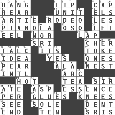 ACROSS 1. Mild oath, euphamism for damn 5. Mouth edge 8. Head covering 11. Located in or toward the back 12. A single undivided whole 14. Raised railways 15. Nick name for Arthur 17. Cowboy competition 18. French article 19. Player piano 21. Bear (Spanish) 22. Allow 23. Snakelike fish 24. And not 25. Infant locale 27. _ Lanka 28. "Mermaids" star 31. Baby powder 35. ___ a Wonderful Life 37. Puff or smoke 38. The main thing one is thinking about 39. It is so 41. Washington bills 42. Lightbulb-shaped fruit 43. Chicken ___ king 45. Egg locale 46. International (abbr.) 47. Curve 49. Being at a high temperature 51. Afternoon social gathering 52. Title for a knight 55. Had dinner 57. Viper 60. Substance 62. For each 63. Cements 65. Leg joints 66. Perceive with the eye 67. Not divided or shared with others 68. Gouge 69. Conclude 70. Nine, plus one 71. Indian titles of respect DOWN 1. Window treatment 2. Nest on high 3. Relating to or accompanying birth 4. Amused look 5. Nilotic language 6. _ china 7. Sliced desserts 8. Portable communications device 9. Toward shelter 10. Inconspicuous attention getter 13. Instrument 16. Immeasurably long periods of time 17. Noteworthy scarcity 20. Australian parrot (variant) 26. Gambison 29. Supplements with great effort 30. State of inaction 31. Native american tent (variation) 32. An important port of Yemen 33. Tough but pliablecoriaceous 34. Monte _, Las Vegas Hotel/Casino 36. Ocean 40. Chalkboards 44. Ancient Greek god of war 48. Keg 50. Labels 52. Contemptuous expression 53. Ancient Celtic tribe of eastern Britain 54. Musical pauses 55. Domed church section 56. Adolescent 58. Groove 59. Whimper 61. Conclusions 64. Car or cant ending