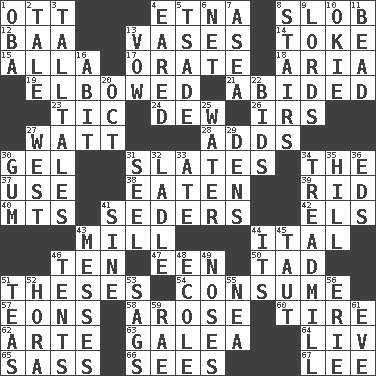 ACROSS 1. Baseball player Mel 4. Inactive volcano in Sicily 8. Messy guy 12. Sound made by sheep 13. Flower holders 14. Puff or smoke 15. Silent film actress Nazimova 17. Speak pompously 18. Roberta Peters solo 19. Shoved, as through a crowd 21. Remained 23. Nervous spasm 24. Morning condensation 26. Big collection agency 27. Electrical Unit 28. Sums up 30. Set 31. Chalkboards 34. Definite Article 37. Purpose 38. Eroded 39. To free from 40. Mountains (abbr.) 41. Spring feasts 42. Raised railways 43. Place where flour is made 44. Slanted text style (abbr.) 46. Nine, plus one 47. Car or cant ending 50. Small amount or degree 51. College papers 54. Ingest 57. Immeasurably long periods of time 58. Came up 60. Hoop that covers a wheel 62. Johnson of "Laugh-In" 63. An organ shaped like a helmet 64. 54 in ancient Rome 65. Backtalk 66. Perceives with the eye 67. Area sheltered from the wind DOWN 1. Chief or king in Benin or Nigeria 2. Falsehood 3. Baron Munchausen's specialties 4. Having ears or earlike features 5. Sadhe (variant) 6. Remaining after all deductions 7. Toward the sea 8. Flight of steps 9. Nobles 10. Migrant worker of the '30s 11. Necklace unit 13. Solemn pledge 16. "This won't hurt ____!" 20. Sep. follower 22. Auction offers 25. Wetness 27. 270 degrees 29. Hiding places for outlaws 30. Chewing product 31. Sew up the eyelids of hawks and falcons 32. Dipping utensil 33. Had dinner 34. Excercise machine 35. Land elevation 36. Begley and Asner 41. Trig term 43. Makes clutter 44. It is 45. Drawn tight 46. Portable shelters 48. Learning spot: Fr. 49. Olfactory organs 51. Beverages made from leaves 52. Israeli folk dance 53. Sinks 55. Teachers' org. 56. 4th largest of the Great Lakes 59. Actress Charlotte 61. First lady