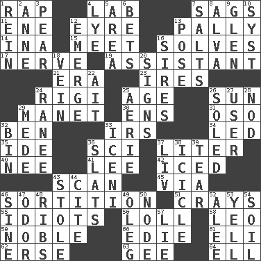 ACROSS 1. Hit sharply and swiftly 4. Experiment locale 7. Settles 11. Compass dir. 12. Jane of fiction 13. Chummy 14. _ tizzy (2 wds.) 15. Confront 16. Finds the solution 17. Effrontery 19. Aide 21. Epoch 23. Angers 24. Swiss mountan, "Queen of the Mountains" 25. Mature 26. Player for Phoenix 29. French painter Edouard 30. Followers of ems 31. Bear (Spanish) 32. Benjamin's nick name 33. Big collection agency 34. Directed 35. Binary compound 36. _-fi 37. 61 cubic inches 40. Born 41. Area sheltered from the wind 42. On the rocks 43. Skim 45. By way of 46. Conclusion 51. Trading vessels 55. Foolish or stupid persons 56. Hang loosely or laxly 58. Lion 59. Impressive in appearance 60. Singer Brickell 61. Connecticut Ivy Leaguer 62. Celtic language 63. Unit of force equal to gravity 64. Pipe bend DOWN 1. It's straight from the horse's mouth 2. Singer Murray 3. Lightbulb-shaped fruit 4. Sodium hydroxide 5. Length times width 6. Stakes 7. Table seasonings 8. Inventor's middle name 9. Small, secluded valley 10. System (abbr.) 12. Develop 13. Airs 16. Founders of families 18. Distinctive style or manner 20. Public displays of written messages 22. Small island 24. The wife of a rajah (variant) 25. Nest on high 26. Having a sole or soles 27. One who makes use of a thing 28. Allow head to fall sleepily 29. Ancient Persian 32. Storage container 33. Ancient Celtic tribe of eastern Britain 36. Narrow boards 37. 54 in ancient Rome 38. Tapering mass of hanging ice 39. Separate forcefully 43. Fur scarf 44. Quote 46. Trig term 47. Aroma 48. Teases 49. Cassini of fashion 50. Connecting point 52. Toward shelter 53. Shout 54. Earth 57. Falsehood