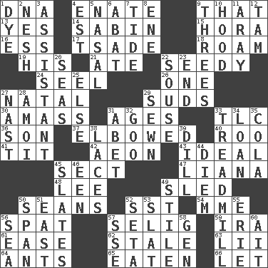 ACROSS 1. Heredity factor (abbr.) 4. Related on the mother's side 9. Not this but _ 13. Consenting reply 14. Unit of acoustic absorption 15. Israeli folk dance 16. Double-curved letter 17. Sadhe (variant) 18. Wander aimlessly 19. Part of HMS, perhaps 21. Had dinner 22. Shabby and untidy 24. Sew up the eyelids of hawks and falcons 26. Single 27. Relating to or accompanying birth 29. Soap bubbles 30. Collect or gather 31. Eons 33. Affectionate concern, for short 36. Manchild 37. Shoved, as through a crowd 40. Friend of Pooh 41. Teat (slang) 42. Period of immesurable duration 43. Standard of perfection 45. Religious group 47. Climbing, woody, usually tropical vines 48. Area sheltered from the wind 49. Downhill vehicle 50. Actors Connery and Penn 52. Fast jet (abbr.) 54. Madame (abbr.) 56. Argument over a trivial matter 57. Major League Baseball Commissioner Bud 59. Lyricist Gershwin 61. Comfort 62. Lacking originality or spontaneity 63. Cards in a Roman deck? 64. Pismires 65. Eroded 66. Allow DOWN 1. Color 2. Soft 3. Aide 4. Eastern Standard Time (abbr.) 5. Rhinal 6. Blind as ____ 7. Periodic rise and fall of the sea level 8. Compass dir. 9. Trios 10. Parka part 11. Like ___ of sunshine 12. Scottish cap 20. Oceans 22. Lush 23. Conclude 25. Otherwise 27. Political cartoonist Thomas 28. Mine, in Marseilles 29. Stitched 31. Collude with 32. Thick or sticky substance 33. Excercise machine 34. Grant temporary use of 35. Root beer relative 38. Shoestrings 39. Deli pickle 44. South Vietnam president (1954) 45. Chalkboards 46. Car or cant ending 49. Vertical member of a panel or frame 50. Connect, as a bridge 51. Compass direction 52. Bristle 53. Narrow board 55. 4th largest of the Great Lakes 56. Ocean 57. Compass dir. 58. Commissioned mil. rank 60. Small island