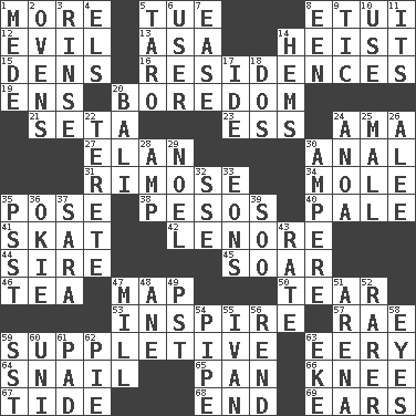 ACROSS 1. Greater amount 5. Third day of the wk. 8. Needle holder 12. Tending to cause great harm 13. White ___ sheet 14. Robbery 15. Lairs 16. Dwellings 19. Followers of ems 20. Mood resulting from idleness 21. Stalk of a moss capsule 23. Double-curved letter 24. Nanny (var.) 27. Liveliness 30. Of or related to the anus 31. Full of chinks, cracks, or crevices 34. Undercover agent 35. Airs 38. Mexican monetary units 40. Diluted with white 41. Three-handed card game 42. Poe poem 44. Title for a man of rank and authority 45. Fly high 46. Beverage made from leaves 47. Atlas unit 50. Rend 53. Stimulate to action 57. Actress Charlotte 59. Supplying deficiencies 63. Suggestive of the supernatural 64. Slow-paced one 65. Baking dish 66. Leg joint 67. Event that recurs at intervals 68. Conclusion 69. Hearing organs DOWN 1. Ancient Persian 2. Baking chambers 3. Remove soap 4. Raised railways 5. Edible starchy tuberous root 6. One who makes use of a thing 7. Comfort 8. Car or cant ending 9. Nervous spasm 10. Purpose 11. It is 14. Cloth borders 17. Binary compound 18. Two (Sp.) 20. Indonesian resort city 22. Cigar-shaped 24. Small Philippine buffalo 25. Promenade 26. Toward shelter 28. Electrical Unit 29. Christmas carol 30. Electrical Unit 32. Compass dir. 33. Immeasurably long periods of time 35. Inconspicuous attention getter 36. Migrant worker of the '30s 37. "Two Mules for Sister ____" 39. "Barney Miller" actor Jack 43. Assign a rank or rating to 47. Place where flour is made 48. One (Scot) 49. Pacific Standard Time (abbr.) 51. Sports stadium 52. More uncommon 54. Corncob 55. "Terrible" tsar 56. Tear apart 58. Sight organs 59. Fast jet (abbr.) 60. Single; one (prefix) 61. Writing tablet 62. Sliced dessert 63. Make supply last