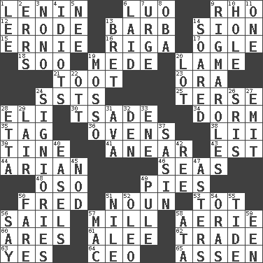 ACROSS 1. Soviet premier 1918-24 6. Nilotic language 9. 17th letter of the Greek alphabet 12. Wear away 13. Sharp remark 14. The Jewish people; Israel 15. Bert's buddy 16. Capital of Latvia 17. Stare at amorously 18. "Barney Miller" actor Jack 19. Ancient Persian 20. Unable to walk 21. A blast of a horn 23. Mouth or opening 24. Fast planes 25. Laconic 28. Biblical high priest 30. Sadhe (variant) 34. Dormintory (informal) 35. Label 36. Baking chambers 38. Cards in a Roman deck? 39. Prong on a fork 41. Approach 43. Eastern Standard Time (abbr.) 44. Believer in; advocate of (suffix) 46. Oceans 48. Bear (Spanish) 49. Sliced desserts 50. Flintstone 51. Part of speech 53. Small child 56. Travel by water 57. Place where flour is made 58. Nest on high 60. Ancient Greek god of war 61. Toward shelter 62. Swap 63. It is so 64. Corporate head (abbr.) 65. NE Netherlands city DOWN 1. Area sheltered from the wind 2. Blunders 3. Words to Nanette 4. Foolish or stupid persons 5. Born 6. Put down 7. Goad 8. Chief or king in Benin or Nigeria 9. Complicated, petty procedures 10. Hollow 11. Single 13. Cy Young winner Saberhagen 14. Flew 19. With motion or animation 20. Car dealer's back yard 22. Baseball player Mel 24. Seigniories (variant) 26. Indian titles of respect 27. Send forth 28. Singer James 29. Den 31. Actress Gardner 32. Lair 33. Compass dir. 37. Indian antelope 40. Artist's stands 42. To separate or throw off 45. Dreamland 47. Michaelmas daisies 49. Whine 50. Conductor's collection 51. Mediterranean tributary 52. Butter sub 54. Mouths or openings 55. Periodic rise and fall of the sea level 56. Declare 57. Apple computer (short form) 58. _ moment's notice (2 wds.) 59. Car or cant ending