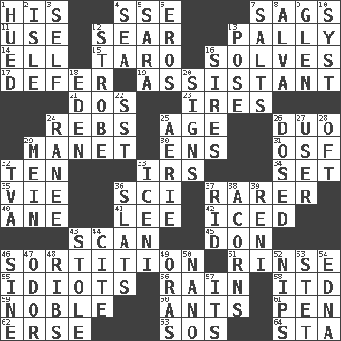 ACROSS 1. Part of HMS, perhaps 4. Compass dir. 7. Sinks 11. Purpose 12. Shrivel 13. Friendly 14. Pipe bend 15. Edible starchy tuberous root 16. Finds the solution 17. Put off 19. Aide 21. Two (Sp.) 23. Angers 24. Confederate soldiers (slang) 25. Mature 26. Superhero pair 29. French painter Edouard 30. Followers of ems 31. Order of Saint Francis (abbr.) 32. Nine, plus one 33. Big collection agency 34. Arrange properly for use 35. Compete 36. _-fi 37. Less widely known 40. A saturated hydrocarbon 41. Area sheltered from the wind 42. On the rocks 43. Skim 45. Spanish title 46. Making a chance decision by using lots 51. Remove soap 55. Foolish or stupid persons 56. Precipitation 58. It would 59. Impressive in appearance 60. Pismires 61. Fenced enclosure 62. Celtic language 63. Distress signal 64. R.R. building DOWN 1. Took on color 2. Small island 3. Automatically 4. Ocean 5. "Two Mules for Sister ____" 6. Greek god of love 7. Table seasonings 8. Inventor's middle name 9. Small, secluded valley 10. System (abbr.) 12. Disco prop 13. Introduce or present, as a question 16. Founders of families 18. Locale of original sin 20. Omens 22. Fast jet (abbr.) 24. The wife of a rajah (variant) 25. Nest on high 26. Administered medicine 27. One who uses or employs something 28. Often (poetically) 29. Chow _ 32. Federal power corp. 33. Ancient Celtic tribe of eastern Britain 36. Narrow boards 37. To free from 38. Oak nuts 39. Painter Guido (1575-1642) 43. Took without asking 44. Quote 46. Trig term 47. Aroma 48. Chest bones 49. Mouths or openings 50. Billionth: prefix 52. Pinches, bites 53. Proofreading order 54. Pulitzer Prize-winning author Ferber 57. It is