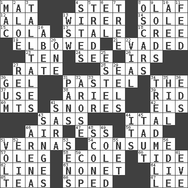 ACROSS 1. Floor covering 4. Proofreading order 8. Norwegian king 12. Chicken ___ king 13. One who wires 14. Flatfish 15. Root beer relative 17. Showing deterioration from age 18. Algonquian 19. Shoved, as through a crowd 21. Eluded 23. "___ Little Indians" 24. Perceive with the eye 26. Big collection agency 27. Assign a rank or rating to 28. Oceans 30. Set 31. Soft color 34. Definite Article 37. Purpose 38. Satellite of Uranus 39. To free from 40. Mountains (abbr.) 41. Sounds asleep 42. Raised railways 43. Backtalk 44. Slanted text style (abbr.) 46. Atmosphere 47. Curvy letter 50. Bit 51. Actresses Bloom and Felton 54. Eat 57. Cassini of fashion 58. Learning spot: Fr. 60. Periodic rise and fall of the sea level 62. Actor's bit 63. Music written for nine 64. 54 in ancient Rome 65. Beverages made from leaves 66. Broke a traffic law 67. Area sheltered from the wind DOWN 1. Big _ 2. Medicinal plant 3. Baron Munchausen's specialties 4. Locates 5. Exchange 6. Snakelike fish 7. Relationship diagram 8. Motion picture awards 9. Nobles 10. Toward shelter 11. Nourish 13. Compass dir. 16. Collude with 20. Single 22. Small bottle 25. First name in cosmetics 27. Remainder 29. Snakelike fish 30. Chewing product 31. Baking dishes 32. Came up 33. Title for a knight 34. Excercise machine 35. Land elevation 36. Begley and Asner 41. "Two Mules for Sister ____" 43. Scorches 44. ___ a Wonderful Life 45. Tense 46. Sports stadium 48. Biscuitlike quick bread 49. Having a sole or soles 51. Electrical Unit 52. Writer Wiesel 53. Elected reps. 55. Remaining after all deductions 56. Singer Brickell 59. Police officer (slang) 61. Night before a holiday