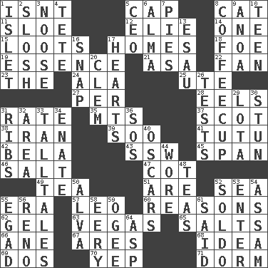 ACROSS 1. Is not 5. Head covering 8. Domesticated feline 11. _ gin 12. Writer Wiesel 14. Single 15. Plunders 17. Residences 18. Enemy 19. Substance 21. White ___ sheet 22. Air blower 23. Definite Article 24. According to 25. Shoshoni 27. For each 28. Snakelike fish 31. Pace 35. Mountains (abbr.) 37. Native of Scotland 38. SW Asia republic 39. "Barney Miller" actor Jack 41. Ballerina skirt 42. Actor Lugosi 43. Compass dir. 45. Connect, as a bridge 46. Table seasoning 47. Small bed 49. Beverage made from leaves 51. "We ___ not amused" (Victoria) 52. Ocean 55. Epoch 57. Lion 60. Thinks logically 62. Set 63. Viva Las _ 65. Table seasonings 66. One (Scot) 67. Ancient Greek god of war 68. It may be bright or harebrained 69. Two (Sp.) 70. Slangy assent 71. Dormintory (informal) DOWN 1. Small island 2. Make a splashing sound 3. Trap for birds or small mammals 4. False hair 5. Corporate head (abbr.) 6. _ mater 7. Sliced desserts 8. Java holder (2 wds.) 9. Small Philippine buffalo 10. Adolescent 13. Son of Isaac 16. Fastener 17. Centers of feelings and intuitions 20. Clement's nick name 26. Trials 29. Globular water bottle used in Asia 30. Astound 31. Chest bones 32. Type of rug 33. Baron Munchausen's specialties 34. Maternal 36. Mayday 40. Motion picture awards 44. Had on 48. Afternoon social gatherings 50. Inventor's middle name 52. Twentieth part of a lira 53. Keyboard key 54. Indian state 55. Mild oath 56. Former U.S. Attorney General Janet 58. Suggestive of the supernatural 59. Double curve, resembling the letter S 61. Alleged 64. Viper