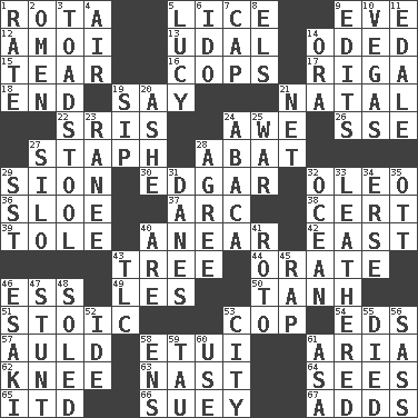 ACROSS 1. Roll call or roster of names 5. Louse (plural) 9. First lady 12. Mine, in Marseilles 13. Freehold land 14. Wrote a lyric poem 15. Lacerate 16. 911 reaches them 17. Capital of Latvia 18. Conclude 19. Declare 21. Brizilian seaport 22. Indian titles of respect 24. Deep reverence 26. Compass dir. 27. Staphylococcus 28. Blind as ____ 29. The Jewish people; Israel 30. _ Allan Poe 32. Butter sub 36. A type of plum 37. Curve 38. Sure thing 39. Lacquered or enameled metalware 40. Approach 42. 90 degrees 43. Woody plant 44. Declaim 46. Double-curved letter 49. French article 50. Hyperbolic tangent 51. Unemotional 53. Police officer (slang) 54. Begley and Asner 57. Old (Scot.) 58. Needle case 61. Roberta Peters solo 62. Leg joint 63. Political cartoonist Thomas 64. Observes 65. It would 66. Chop _ 67. Does sums DOWN 1. Assign a rank or rating to 2. Presage 3. Inedible or poisonous agaric 4. Atmosphere 5. "I Love _" 6. Wedding promise 7. Head covering 8. Raised railways 9. Proofreads 10. Viva Las _ 11. Peak District village in England 14. Mouth or opening 19. Small drink 20. American tennis player Robert 21. Remaining after all deductions 23. Indian princess (variant) 24. Phillipine bananalike plant 25. Armed conflict 27. Grain storage tower 28. Match 29. Fast jet (abbr.) 31. Natives or inhabitants of Denmark 32. Sea 33. Tough but pliablecoriaceous 34. Celtic language 35. Baseball player Mel 40. "We ___ not amused" (Victoria) 41. Printing process, for short 43. Affectionate concern, for short 45. Reproach for some lapse or misdeed 46. 1973 Nobel Price Winner (Physics) Leo 47. Check the growth or development of 48. Having a sole or soles 52. Binary compound 53. Municipality 55. Passed on 56. Backtalk 58. Followers of ems 59. The 19th letter of the Greek alphabet 60. Purpose 61. White ___ sheet
