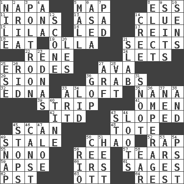 ACROSS 1. California wine valley 5. Atlas unit 8. Curvy letter 11. Metal shackles 13. White ___ sheet 14. A slight indication 15. Pale purple color 16. Directed 17. It's straight from the horse's mouth 18. Erode 19. Water jar 21. Religious groups 22. French philosopher Descartes 24. Allows 25. Eats (away) 27. Actress Gardner 29. The Jewish people; Israel 30. Takes hold of 32. Pulitzer Prize-winning author Ferber 33. At or to great height 35. Grandmother 39. Remove all contents or possession from 41. Sign of something about to happen 42. It would 43. Had an oblique or slanted direction 45. Examine minutely or intensely 48. Carryall 49. Lacking originality or spontaneity 50. US Secretary of Labor Elaine L. _ 52. Hit sharply and swiftly 55. Words to Nanette 56. To riddle 57. Pulls into pieces 59. Domed church section 60. Big collection agency 61. Gurus 62. Pacific Standard Time (abbr.) 63. Baseball player Mel 64. Relief DOWN 1. The longest river in the world 2. Roberta Peters solo 3. Characterized by complete cowardliness 4. Santa ___, CA 5. Promenade 6. Toward the sea 7. Writing tablet 8. Opt 9. Sets of matching outer garments 10. Elected reps. 12. Biscuitlike quick bread 14. Algonquian 20. French article 21. Broad, flat, thick piece 23. Ferber et al. 25. Compass dir. 26. To free from 27. Sandy's bark 28. Large container 30. Republican Party 31. Snout, nose 33. Tate display 34. Flaplike covering 36. Electrical Measurement 37. Born 38. Added to 40. Prong on a fork 43. R.R. building 44. Plunders 45. Constricts 46. 2nd pers. sing. pres. of can (arch.) 47. _ vera 49. Fastener 50. An absolute certainty 51. Behest 53. Ancient Greek god of war 54. Inconspicuous attention getter 56. _ de Janeiro 58. Ewer handle